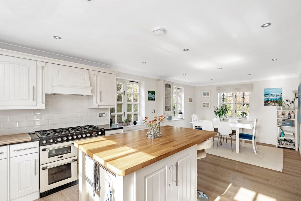 7.2m x 4m (23' 7" x 13' 1") A triple aspect room with double glazed windows to front, side and rear aspects, fitted in a range of base, drawer and wall mounted units with complementing work surfaces and tiling, Butler style sink unit with mixer tap, space and plumbing for dishwasher, space for range style cooker with extractor fan over, space for American style fridge freezer, radiator, TV point, laminate flooring, stable style door to