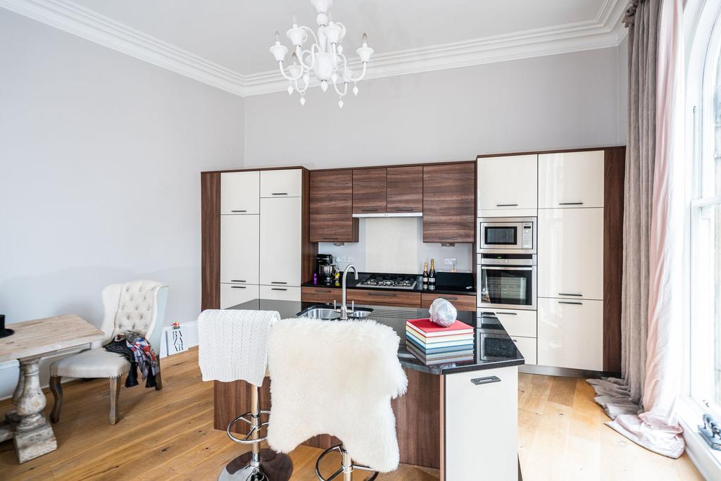 Recently converted and refurbished to a high standard, this apartment enjoys an elevated position on the first floor. With video entry system and security alarm, the accommodation comprises an impressive 34 foot main living/dining room with original floor to ceiling arched sash windows, a wood burning fire and striking ceiling rose. Oak flooring which extends through to the modern high gloss fitted breakfast kitchen with black granite work surfaces and integrated Neff appliances. Central island unit. The master bedroom leads to a stylish en-suite bathroom featuring a free standing bathtub and a walk in shower. There is also a guest w/c.