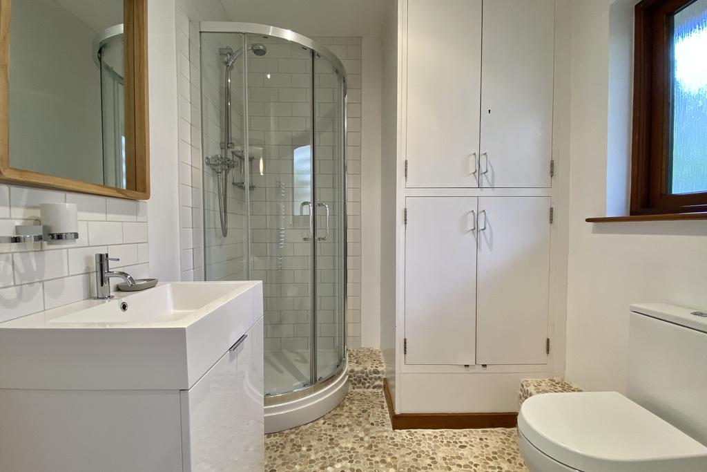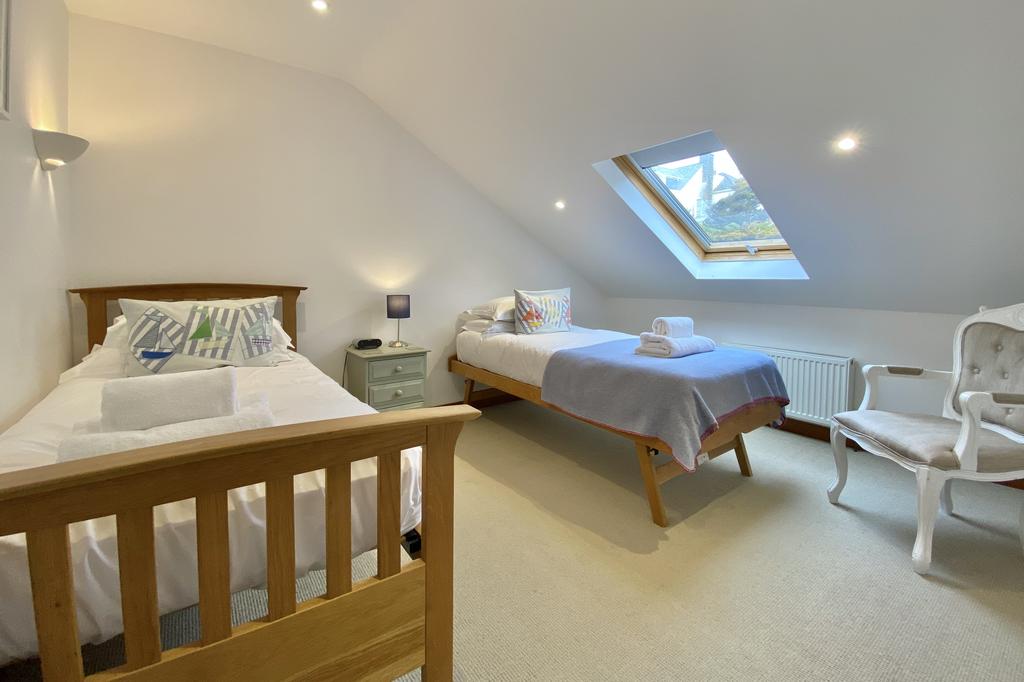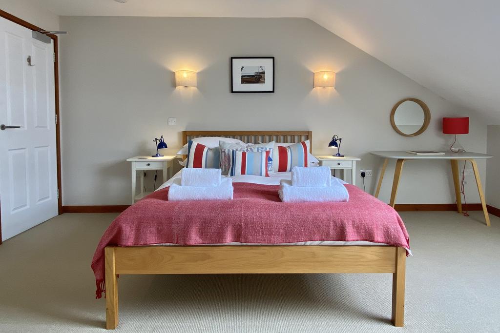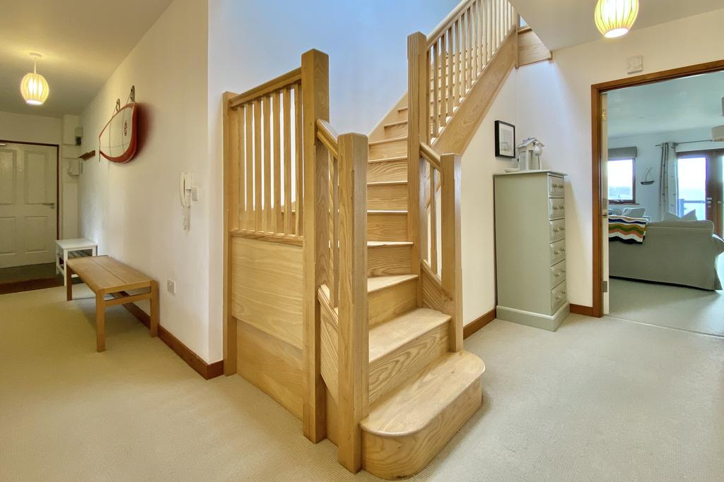 At the end of the long entrance hallway, an oak turned staircase rises to the first floor where the two double bedrooms reside. Both have Velux roof windows with the master bedroom enjoying clear views of the ocean and a stylish en-suite shower room.