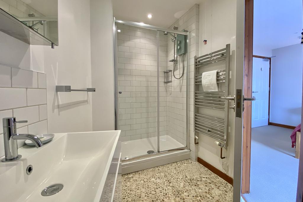 The accommodation is arranged over two floors where the spectacular views can be enjoyed from the spacious open plan living/kitchen/dining room and generous covered balcony. The kitchen is bright and contemporary, with a range of wall and floor cabinets and drawers providing a combination of freestanding and integrated electric oven, four ring gas hob, dishwasher, fridge/freezer, microwave, washing machine and tumble dryer. The family shower room has a contemporary range of sanitary ware, glass shower enclosure and a stone pebble mosaic tiled floor.