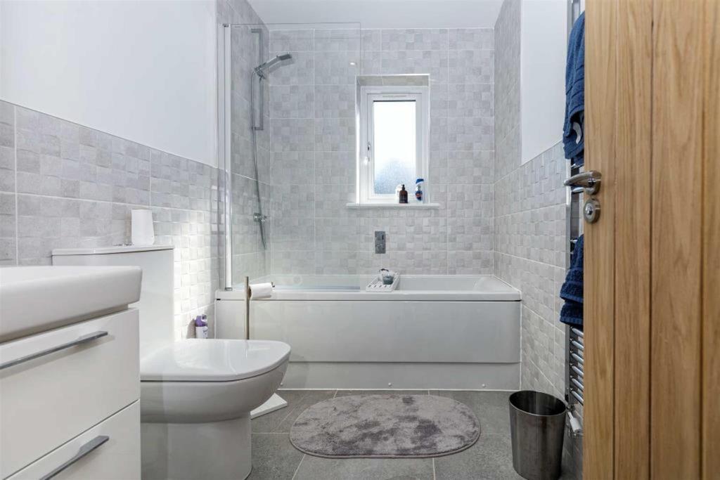 Bathroom - Fitted with a three piece suite comprising of a low flush toilet, vanity unit incorporating underlying drawer storage with an inset basin and monobloc mixer tap and panelled bath with over head hand shower attachment and adjacent glass shower screen. Having a heated towel rail, tiled floor and part tiled walls with a uPVC double glazed window to the side elevation.