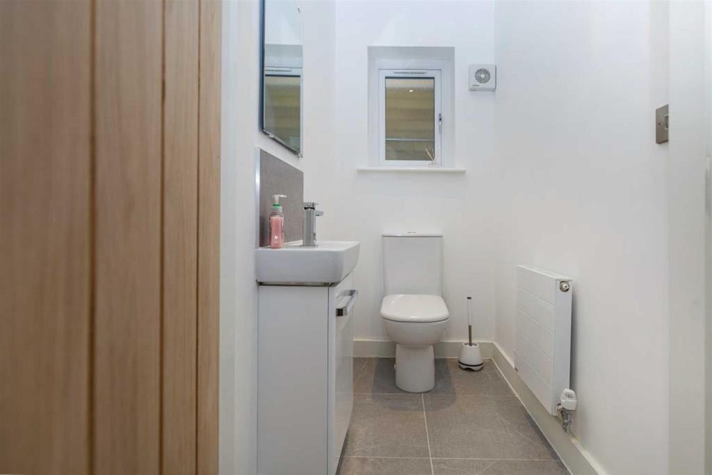 Wc - Fitted with a two piece suite comprising of a low flush toilet, vanity unit incorporating underlying cupboard storage space with an inset basin and monobloc mixer tap, tiled splash backs, a central heating radiator and uPVC double glazed window to the side elevation.