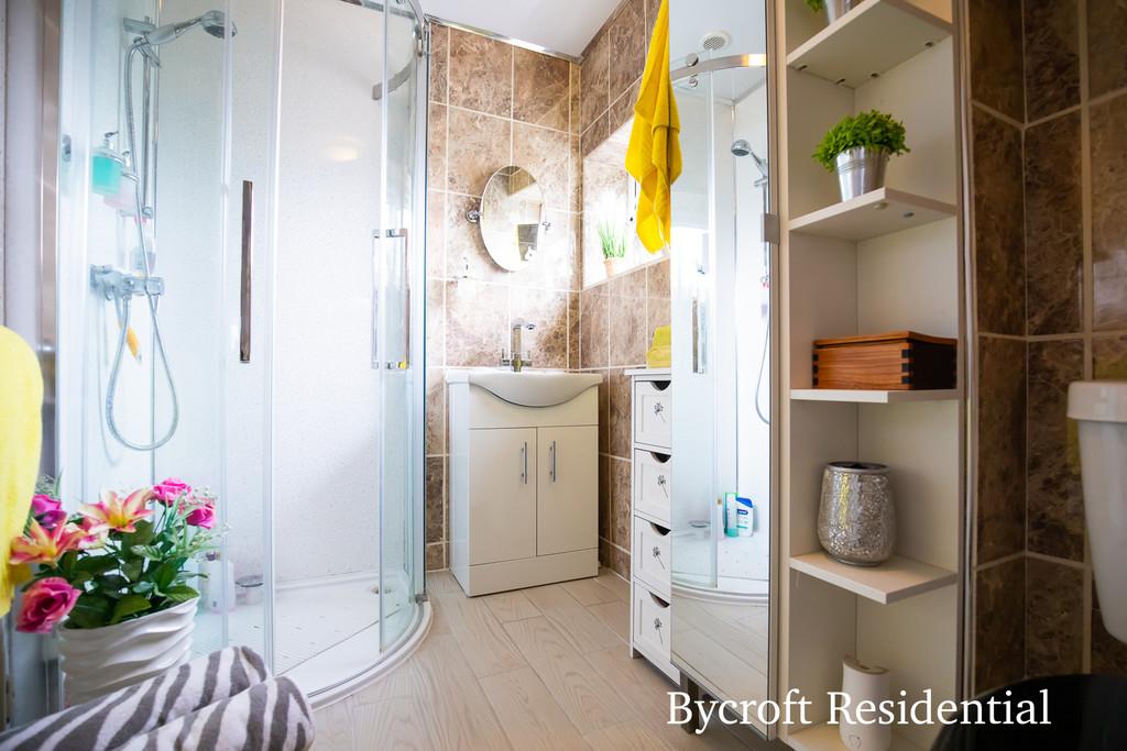 SHOWER ROOM 8' 0" x 5' 5" (2.44m x 1.65m) fitted with a white suite comprising of a low level wc; vanity wash hand basin with mixer tap; corner quadrant shower cubicle with sliding screen doors, wall mounted shower unit and aquaboard wall coverings; tiled walls; UPVC double glazed window to side.