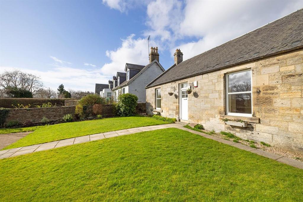 Approached from Newliston Road, the cottage's boundary is defined by a neatly clipped privet hedge, behind which is a mono block paved parking area and a lawn, divided by a path leading to its front door. To the right of the cottage, there is an attractive stone arch and a paved path that allows access to the kitchen door and the rear of the cottage.