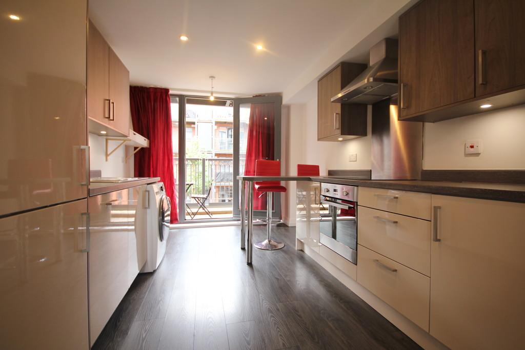 Metalworks is a secure gated development with architecturally designed communal gardens creating a calm oasis for residents. The interior designed living space provides a high-end contemporary finish and includes grey-oak timber-effect flooring with matching grey oak doors, fully fitted kitchen with integrated Hotpoint appliances which include a dishwasher and large double glazed windows for natural light, which open out onto the balcony overlooking the communal gardens. Fully carpeted and spacious bedrooms provide the ideal environment for calm relaxation. The bathroom features a full size pressed steel bath, Porcelanosa vanity unit with under-sink storage, and fitted wall mirror and separate shower cubicle with glass and chrome door. Ceramic Porcelanosa floor and wall tiles further compliment the apartments stylish design.