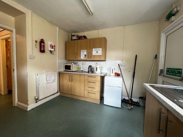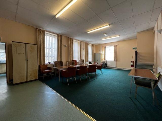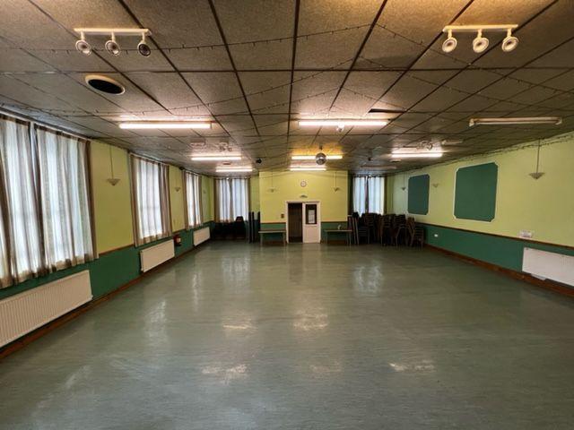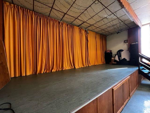 Vinyl flooring. Flat plastered walls and suspended ceiling. Five double radiators. Five uPVC and double glazed windows. Steps to the stage area. Storage room. Many sockets and strip lighting.