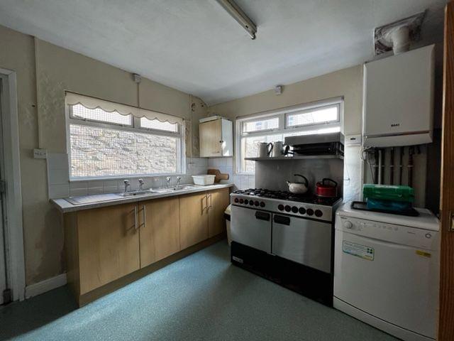 Vinyl flooring. Part tiled and part flat plastered walls. Artex ceiling. Wall and base units with laminate worktops and tiled splashbacks. Two uPVC and double glazed windows. uPVC fire escape door. Radiator. Wall mounted Baxi combination boiler. Two stainless steel sink and drainers. Large 8 burner gas oven and grill. Space for a washing machine and fridge/freezer.