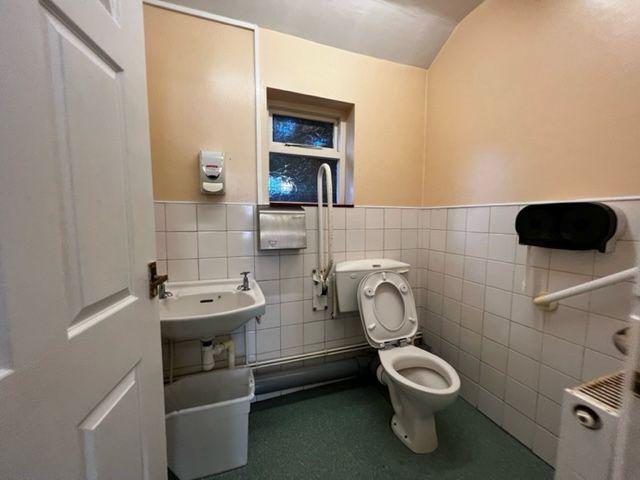 Vinyl flooring. Part tiled and part flat plastered walls and ceiling. Radiator. W/C. Wash hand basin. Storage cupboard. Hand dryer. Handrails. Wooden glazed window.