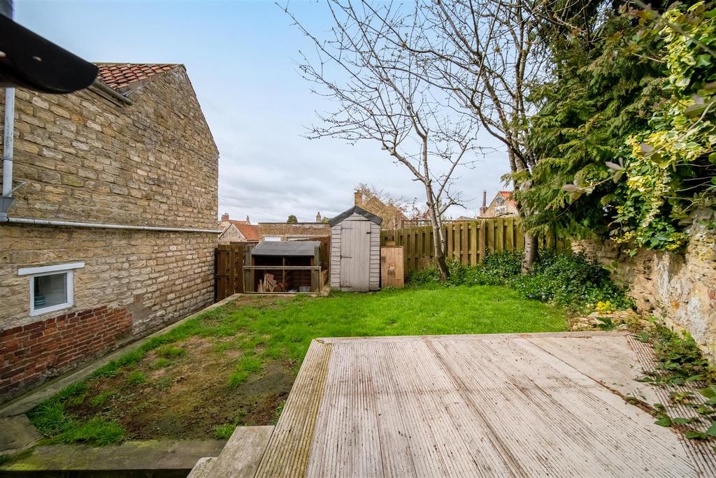 Rear Garden - Raised garden, mainly laid to lawn with plant and shrub borders, decking, outside tap, outside lights, side entrance and a tap, side entrance, shed, log store.
