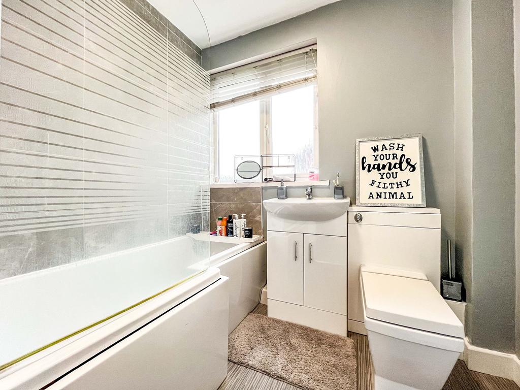 3 piece white suite with chrome effect fittings comprising: Low level w/c, panelled bath with overhead mains fed shower and fitted screen, vanity basing with storage, radiator.