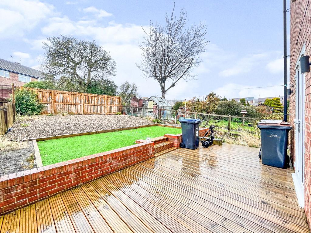 Fully enclosed low maintenance garden laid with artificial grass, decking and stone chippings, side storage and access.