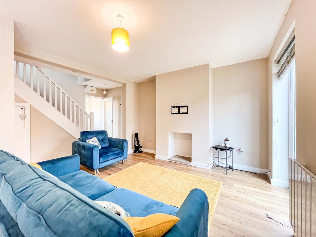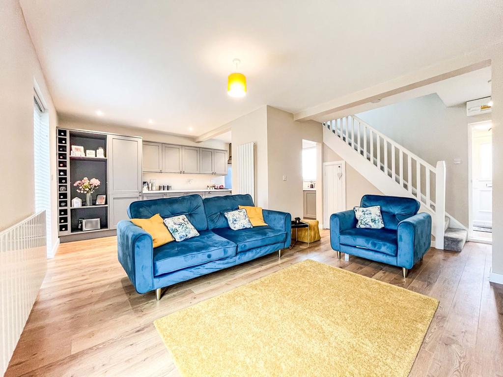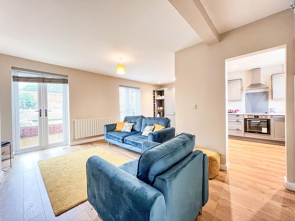 Designer radiators, laminate flooring, open staircase, focal fire space, 2x French doors to rear with fitted blinds and storage cupboard.