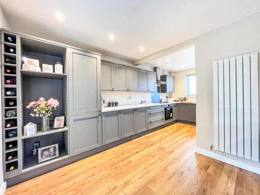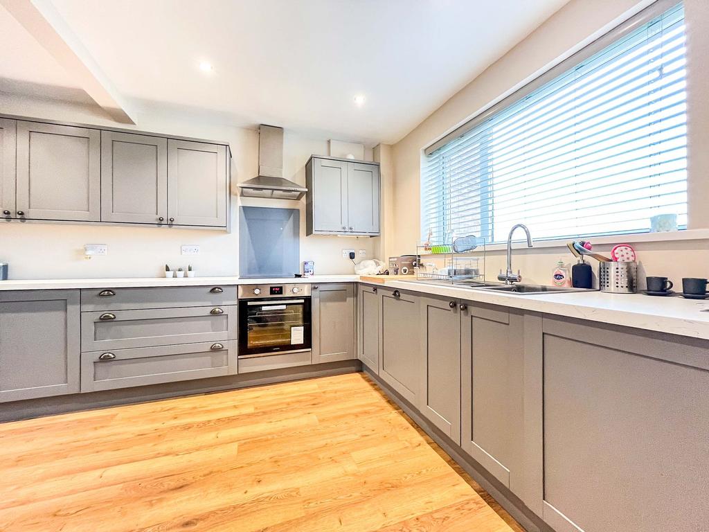 Fitted base and wall units with contrasting work surfaces incorporating a stainless steel electric oven and hob with splash back, sink and drainer with mixer tap, pan drawers, integral dishwasher and washing machine, laminate flooring, French doors to rear with fitted blinds.