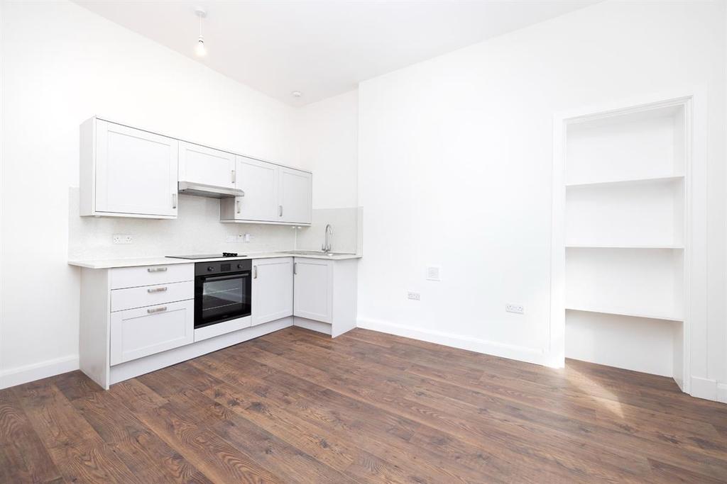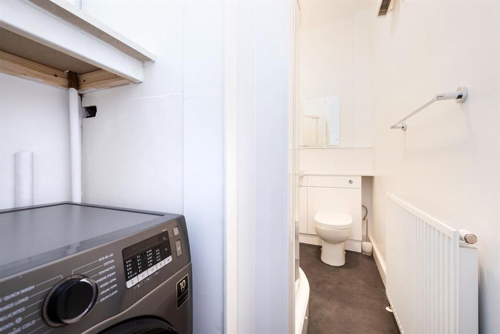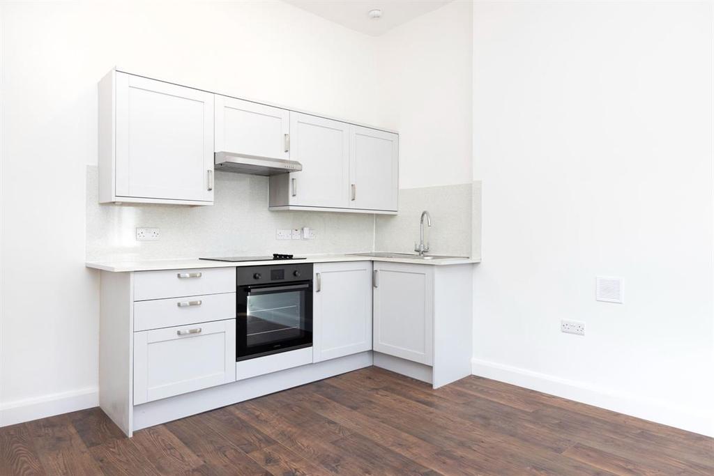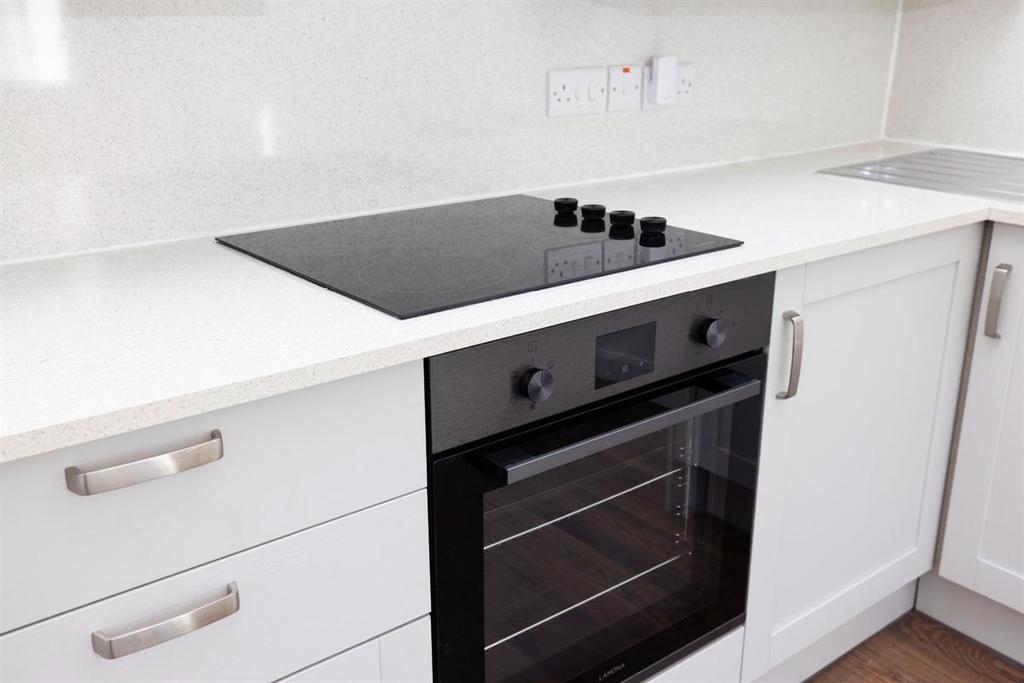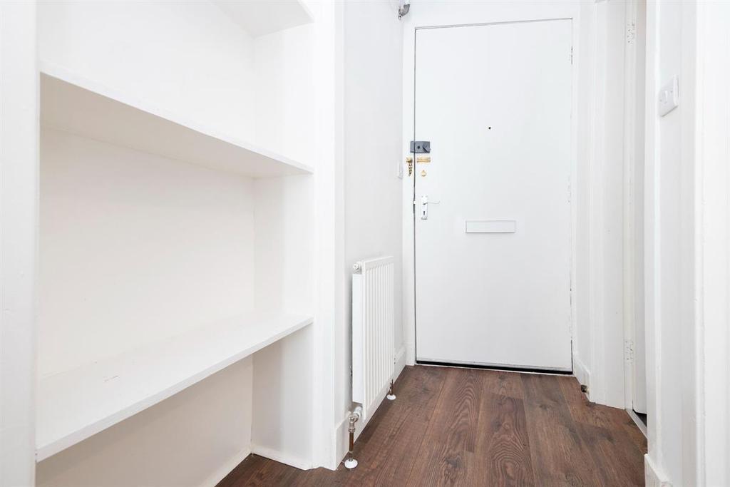 The entrance hall offers direct access to all rooms and has built-in shelving. The bright east facing living room overlooks the street and has recessed shelving, storage under the twin windows and a large built-in cupboard that also houses the central heating boiler. The modern kitchen forms part of the living room; it has both floor and wall mounted storage units, down lit work surfaces with splash back protection and an integrated electric cooker and hob with extraction unit above and space for a fridge freezer.