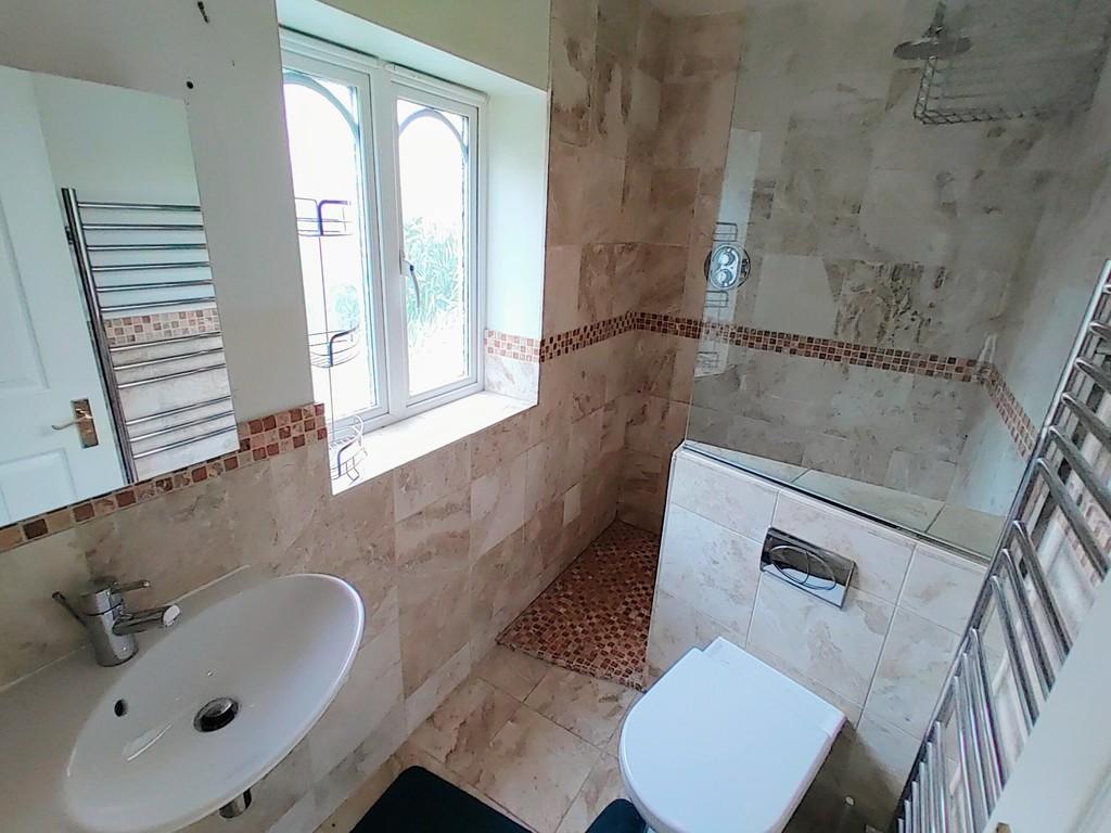 ENSUITE Limestone wall tiling with mosaic detail, walk-in shower enclosure with rainfall shower and glass screen, push button WC and a wall mounted wash basin. Ceiling spotlights, window to the front and chrome heated towel rail.