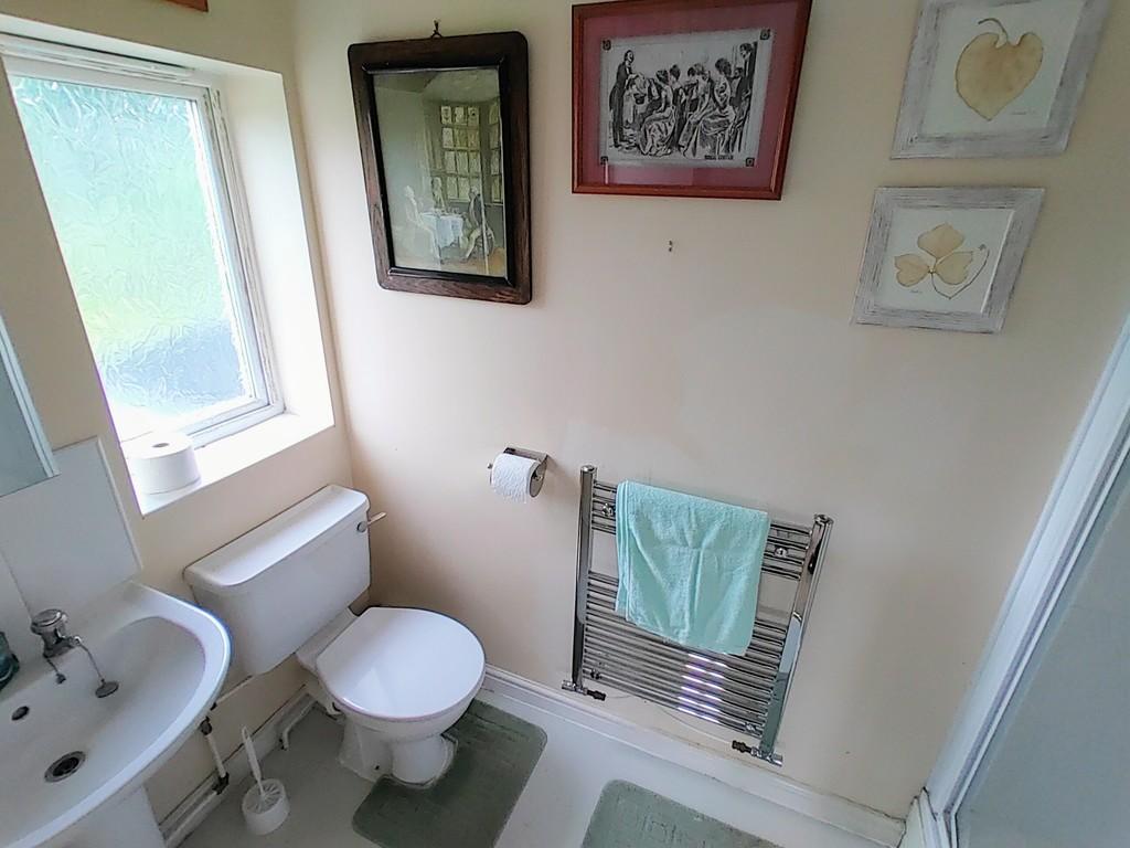 ENSUITE Shower cubicle with glass door, pedestal wash basin and a WC. Window to the side, extractor fan and a chrome heated towel rail.