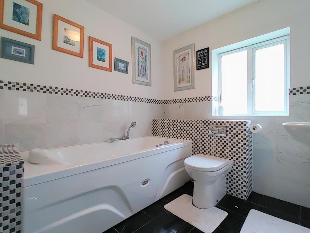 BATHROOM Feature marble wall tiling and a jacuzzi bath with rainfall tap and shower attachment. Push button WC and a wash basin set in a vanity unit with storage below. Chrome heated towel rail, window to the side and an extractor fan.