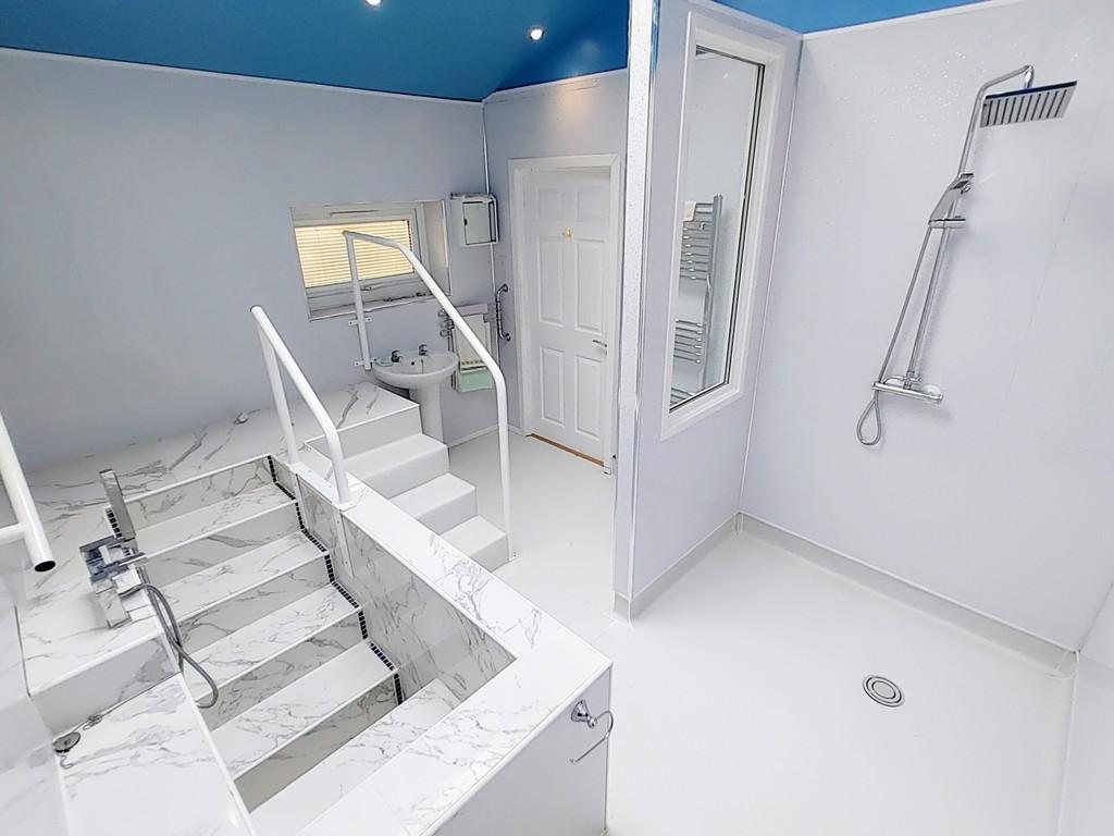 ENSUITE 11' 9" x 9' 3" (3.58m x 2.82m) A large and impressive bathroom with a sunken bath with steps and a seat, open plan rainfall shower, pedestal wash basin and a push button WC. Flooded with natural light from a large skylight window and a further window to the side. Ceiling spotlights and a shaver point.