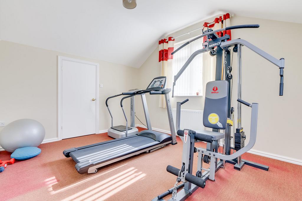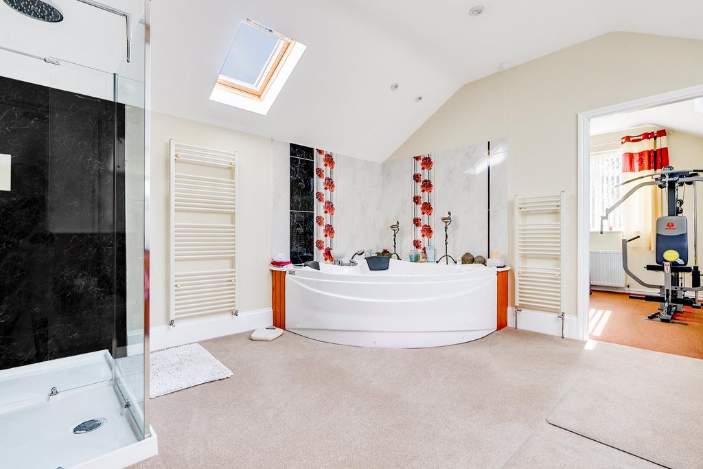 To the first floor is the master bedroom suite with a walk in wardrobe and a large ensuite featuring a modern walk- in shower, jacuzzi type double bath tub and matching his and her sinks. Further through the ensuite is a home gym, which could also double as a study for a professional buyer, with a large eves storage area. There is also two more double bedrooms on the first floor and a family bathroom.