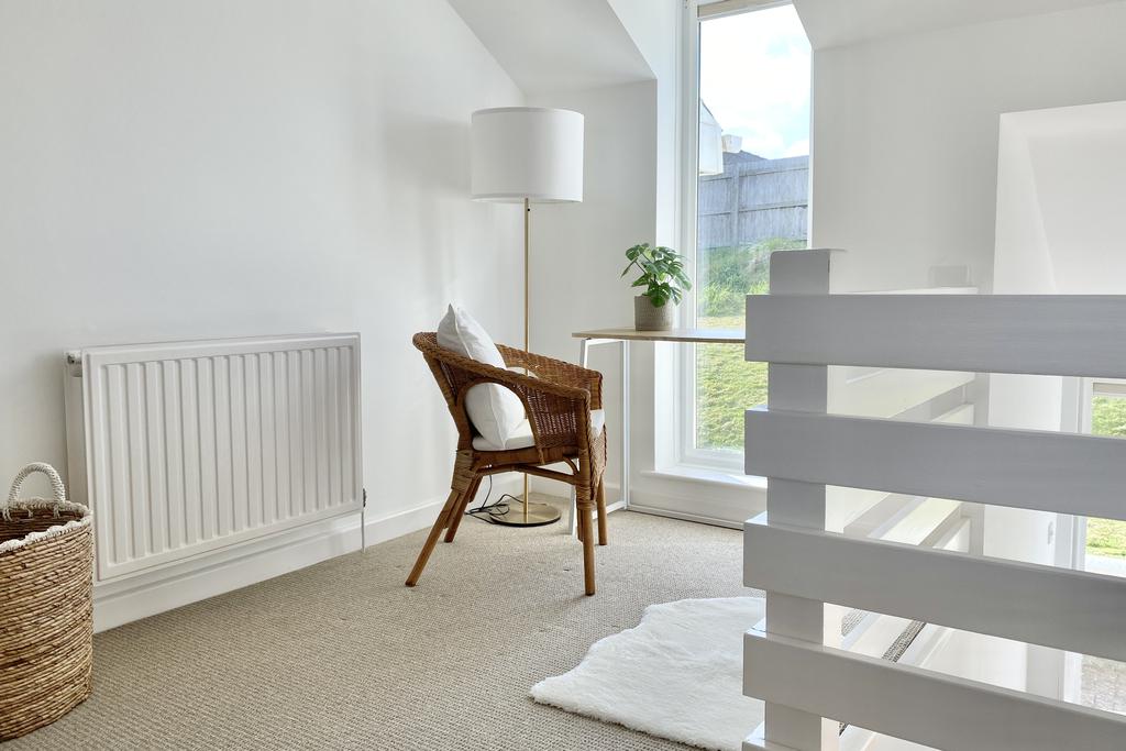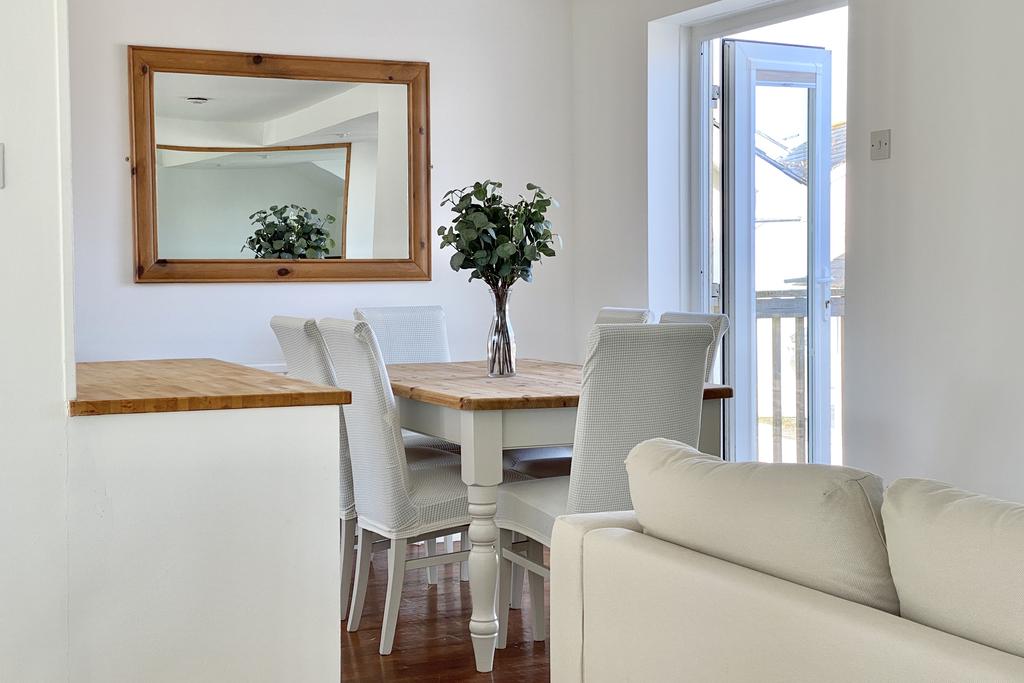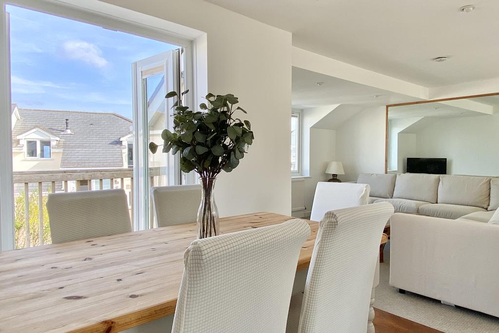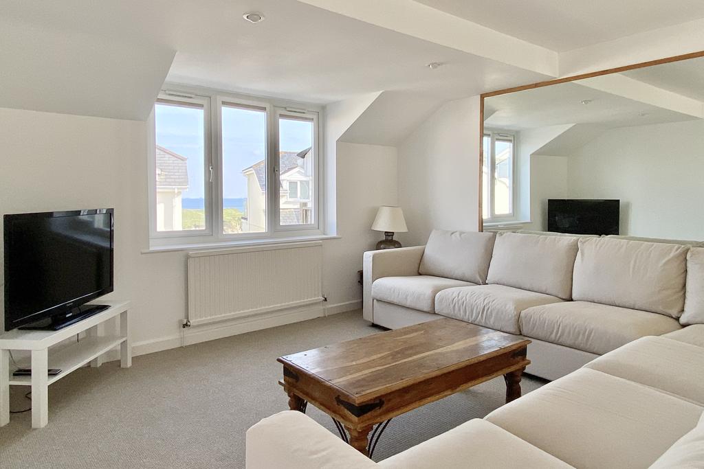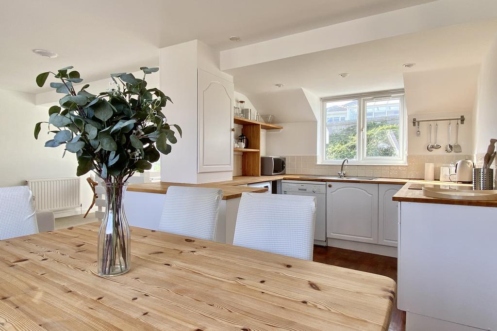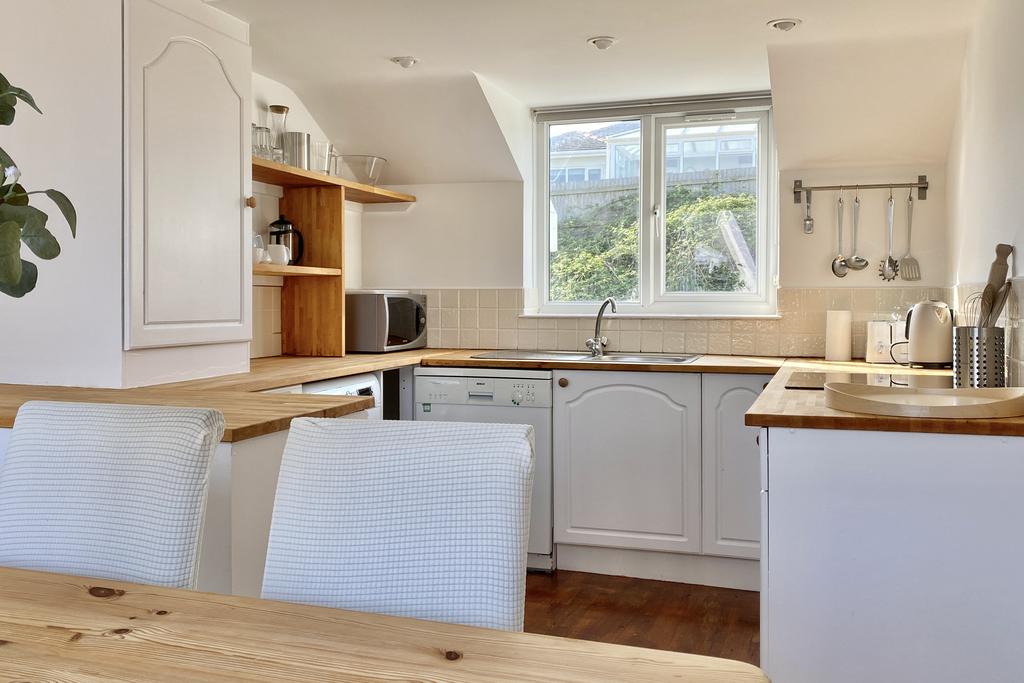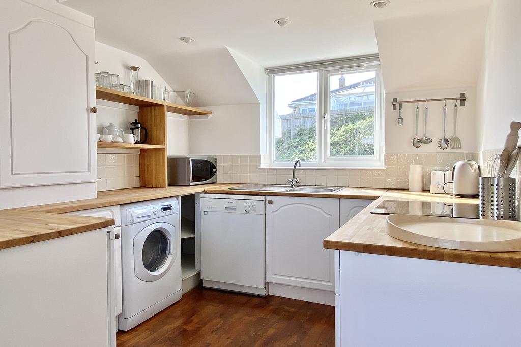 Extremely well presented, the property is arranged in a reverse living design to make the most of the impressive views from the first floor. The open plan first floor is light, generously spacious and perfect for entertaining with a sitting area, dining area and fully equipped kitchen. The kitchen is complete with a electric hob, electric oven, stainless steel sink unit and space for a dishwasher, fridge/freezer and washing machine. A balcony is accessible from the open plan area providing great views of the beach at Porth, Porth Island and the ocean beyond.