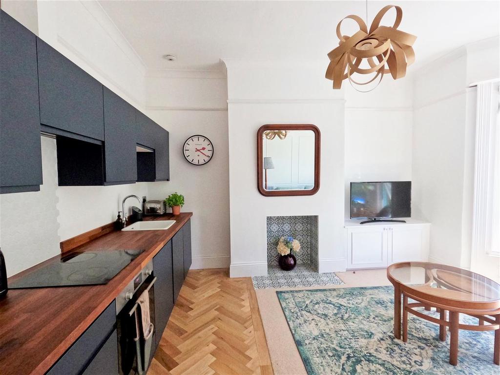 Open Plan Lounge/Kitchen: - 4.88m into bay window x 4.11m into chimney recess - Attractive ornamental chimney breast with tiled inset and hearth, low-level built in storage units with T.V. display mantle, sealed unit uPVC double-glazed windows, traditional radiator, feature raised paneling to one wall, picture rails. Modern fitted kitchen units incorporating cupboards, drawers, solid wood work surfaces, inset sink bowl with period style mixer tap, inset Samsung ceramic hob with extractor hood above and with mosaic tiled splash back, stainless steel oven under, integrated fridge, integrated washing machine, Engineered oak floor, larder cupboard.