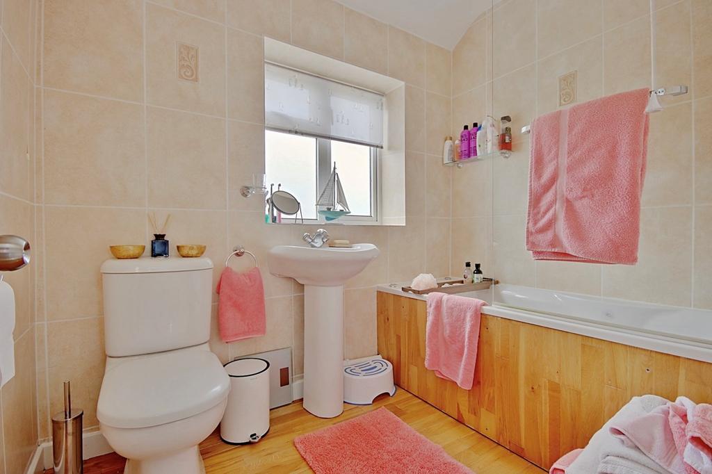 Bath with wall mounted electric shower. Low flush unit toilet and pedestal sink. Obscured double glazed window. Tiled walls. Ceiling light point and radiator.