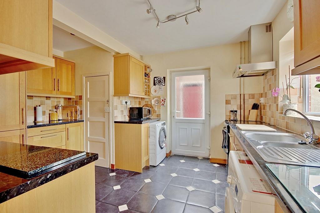 10' 5" x 12' 0" (3.17m x 3.66m) Fitted kitchen with matching base and wall storage units, featuring a range integrated appliances including; 1.5 sink with chrome mixer tap and drainer, Fridge-freezer, Electric Oven, Four circle electric hob unit & Extractor fan. Recess for washing machine and tumble dryer. Tiled splash-back. Pantry cupboard with door access. Double glazed window and door though to rear garden. Ceiling light points.