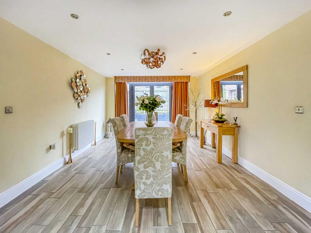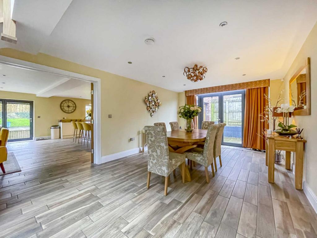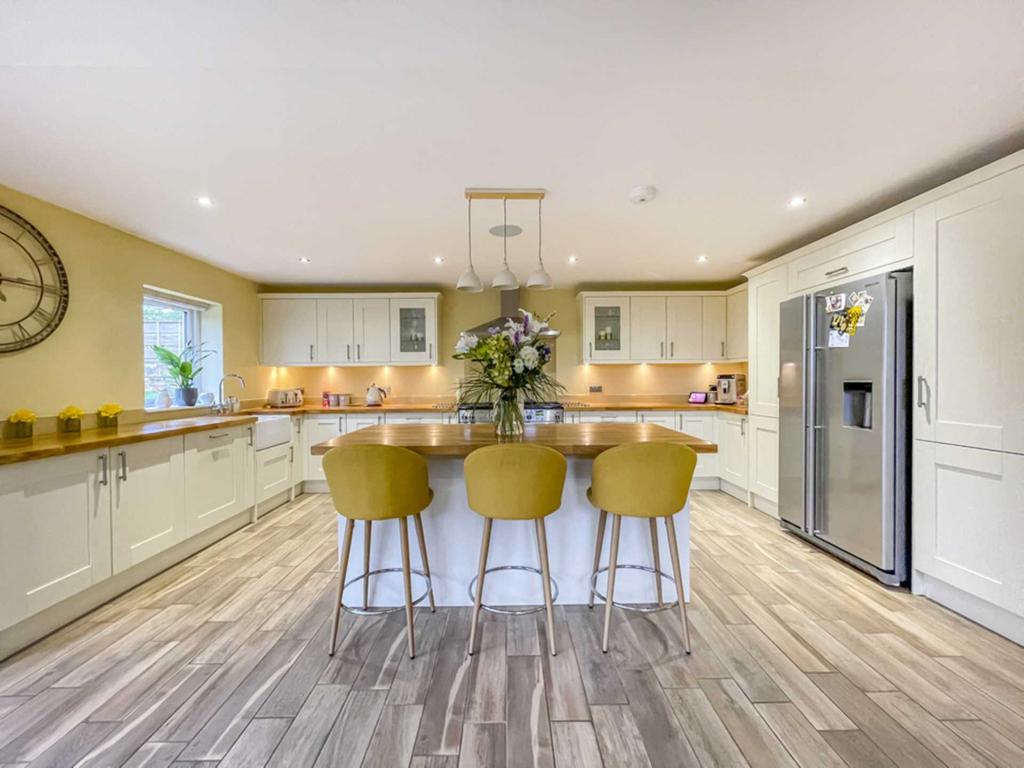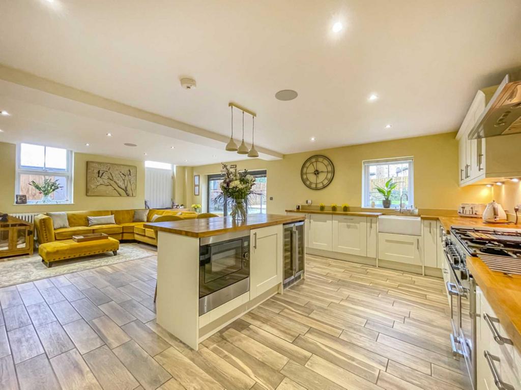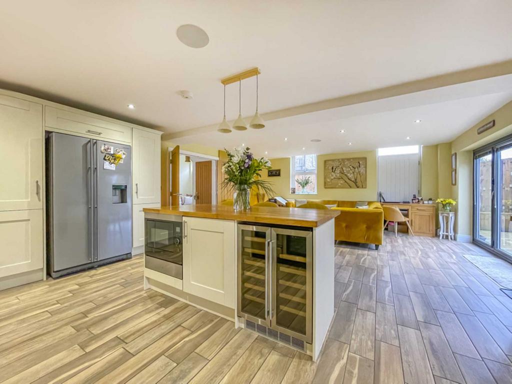 Superb spacious reception area with an excellent range of modern base and wall units incorporating glazed display units, butcher block work surfaces and complementary centre island. Integrated appliances include six ring gas range with electric oven, American style fridge freezer, microwave and wine fridge. Belfast style sink. Inset down lights, bi fold doors in the family area lead into the rear garden. Contemporary wall mounted radiator.