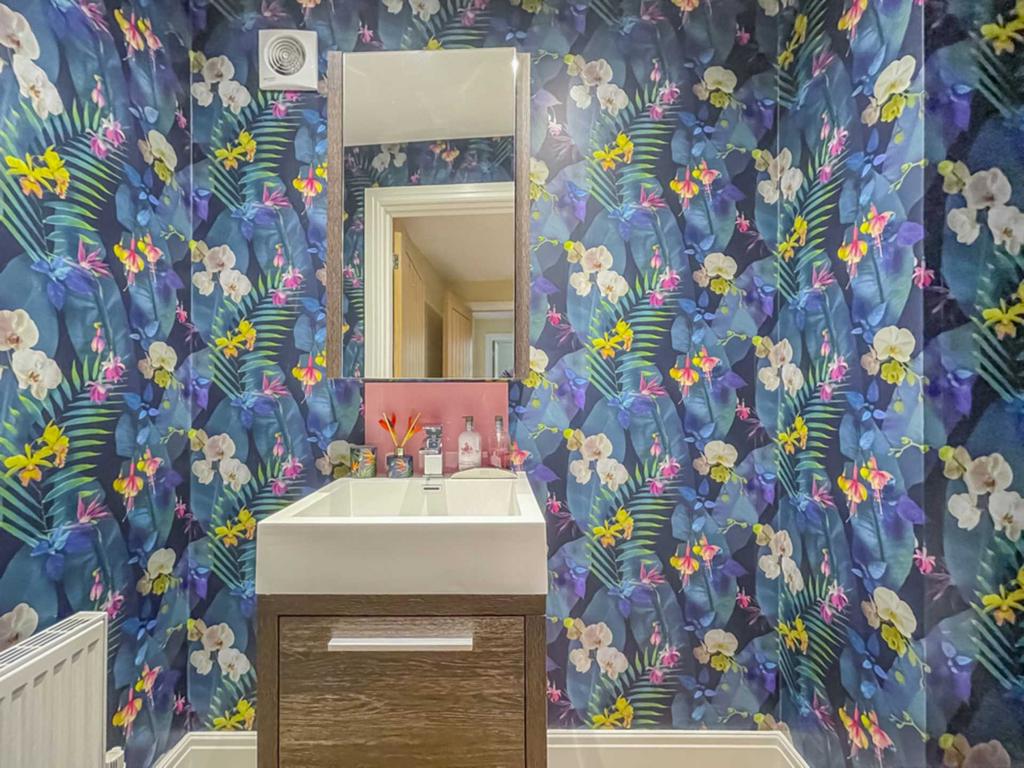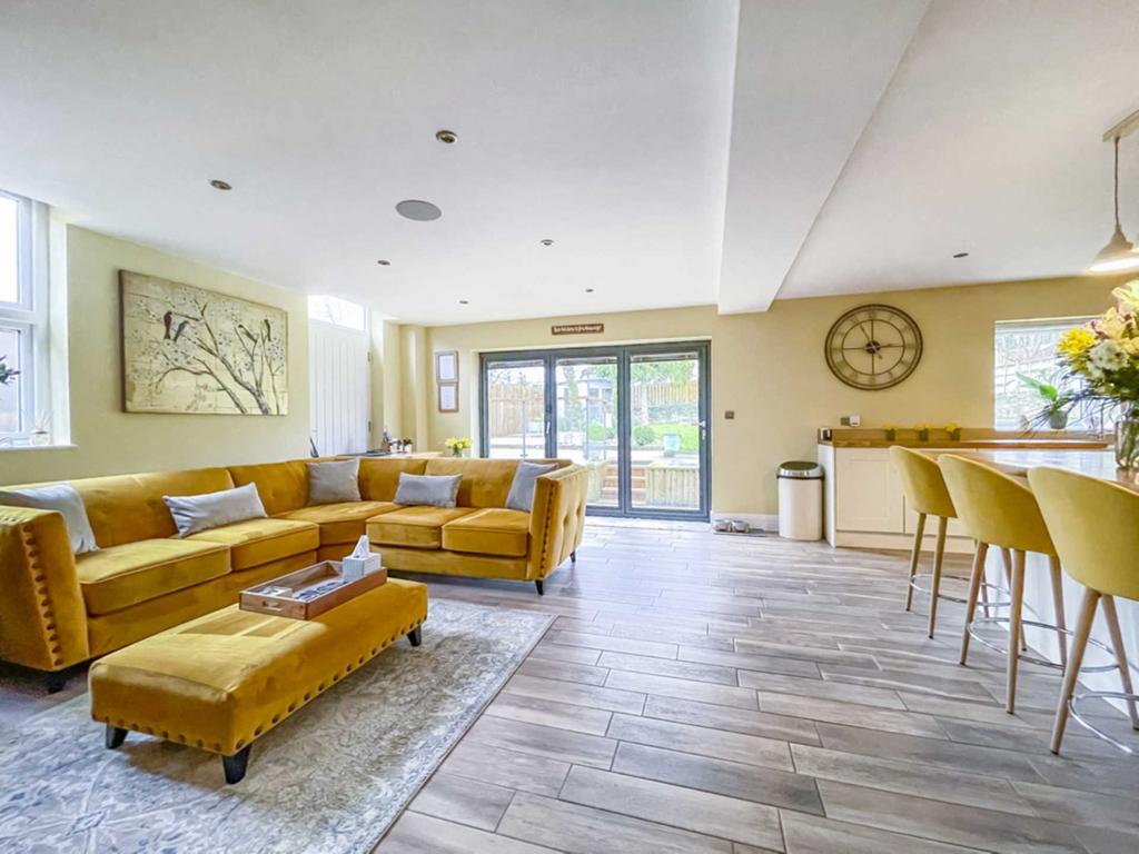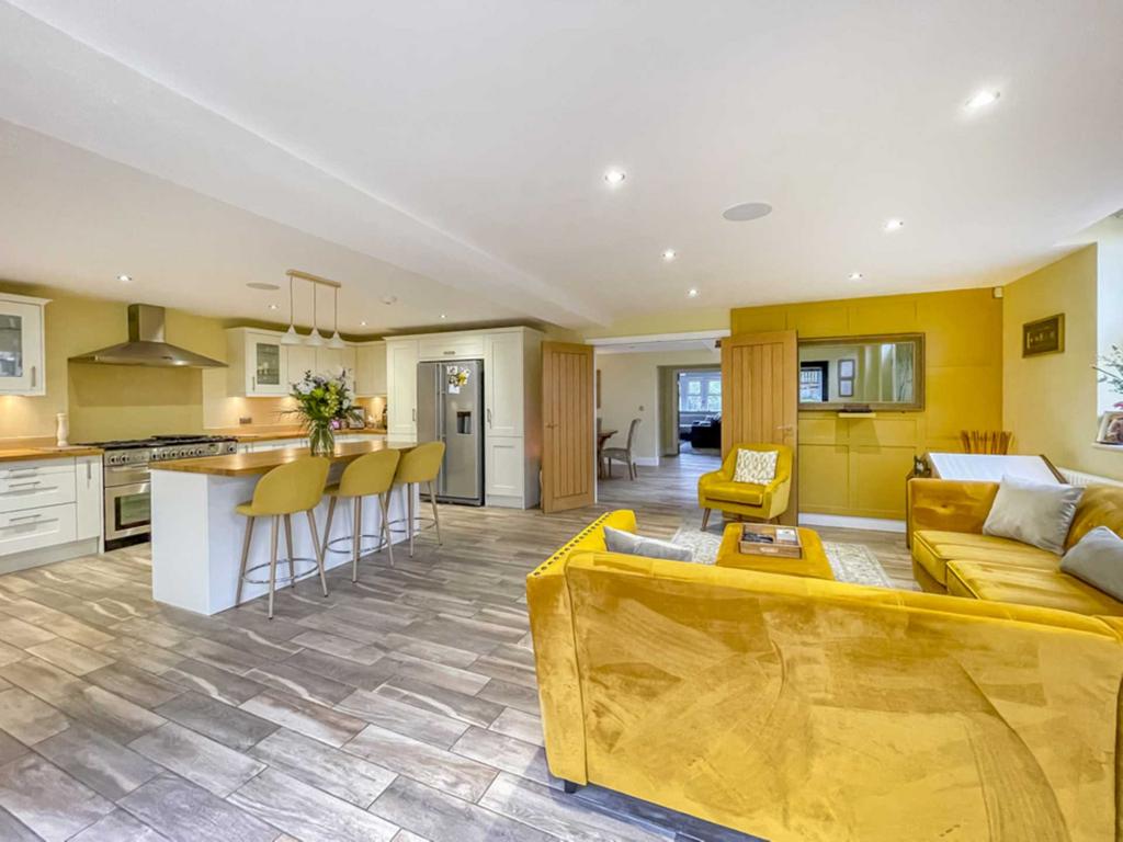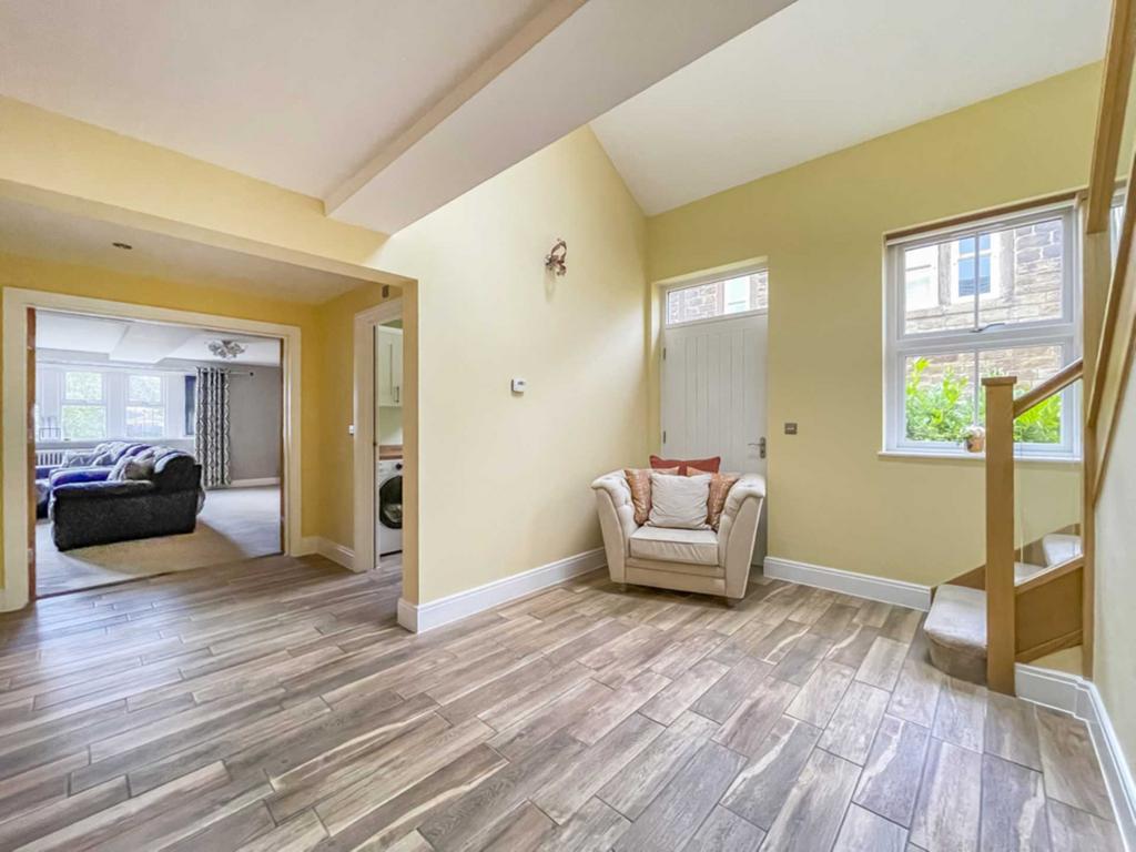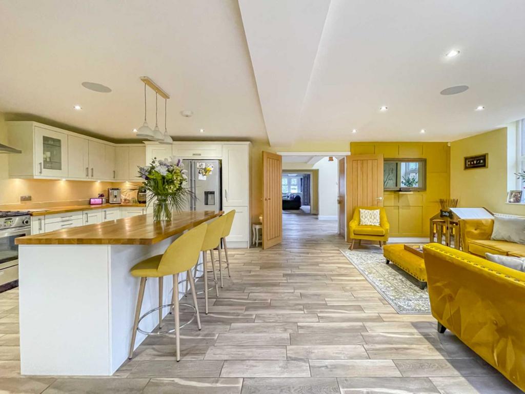 Superb spacious reception area with an excellent range of modern base and wall units incorporating glazed display units, butcher block work surfaces and complementary centre island. Integrated appliances include six ring gas range with electric oven, American style fridge freezer, microwave and wine fridge. Belfast style sink. Inset down lights, bi fold doors in the family area lead into the rear garden. Contemporary wall mounted radiator.
