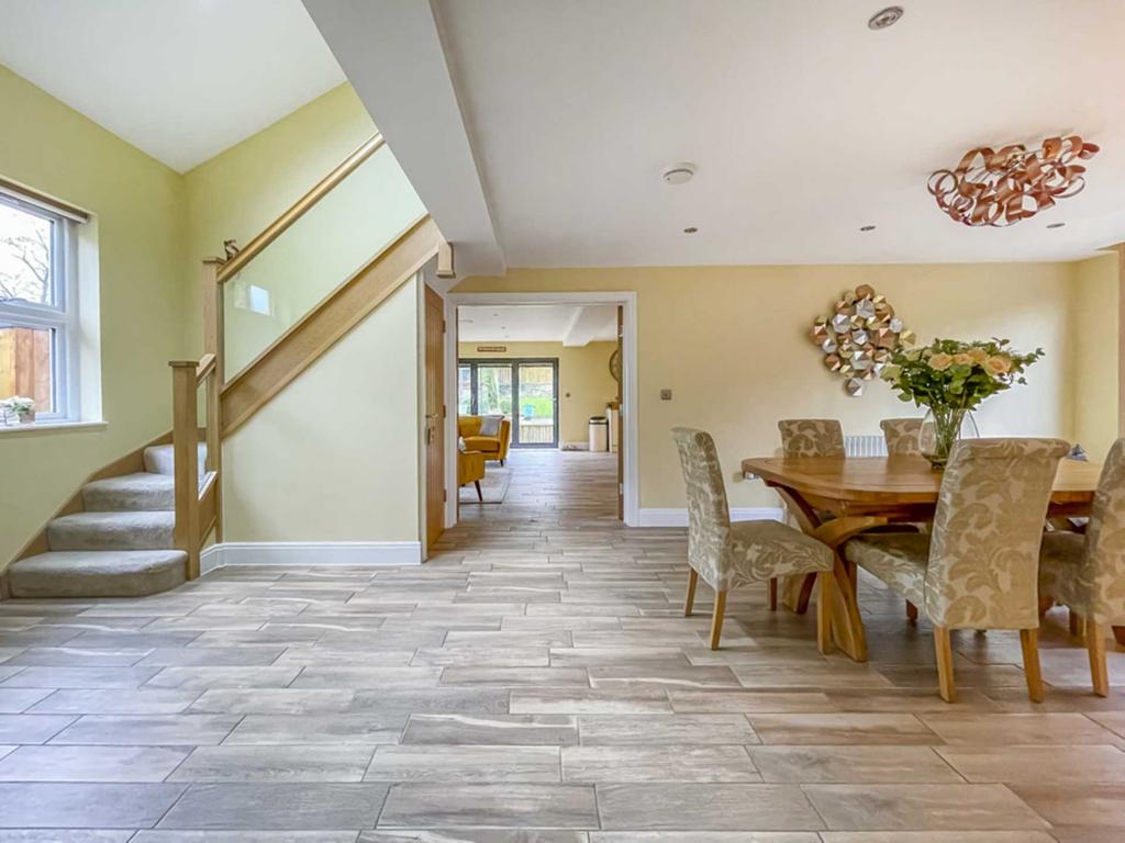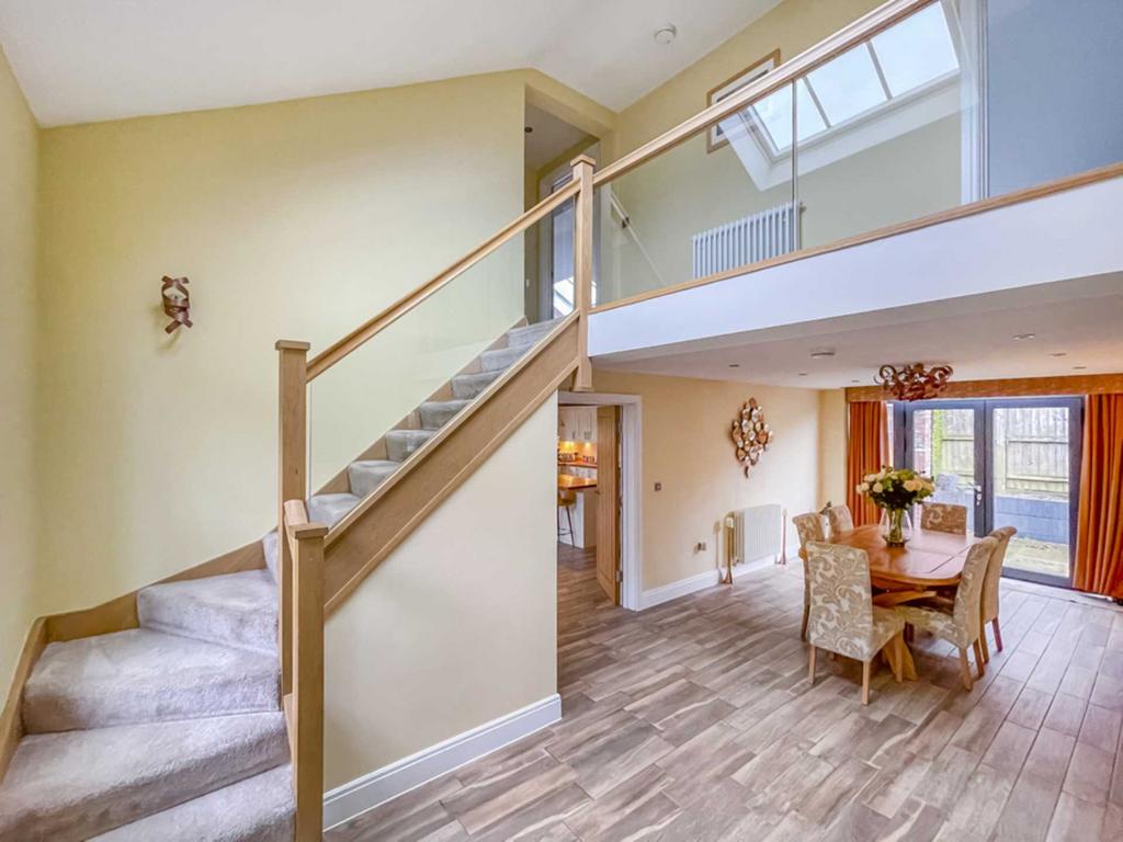 A superb dining hall with galleried landing and under stairs storage area.