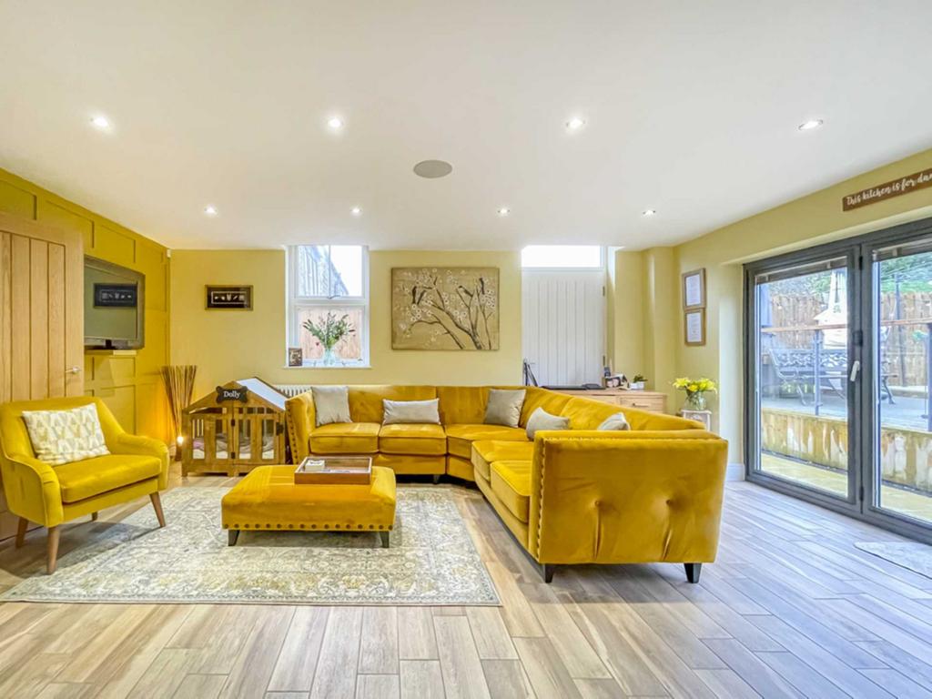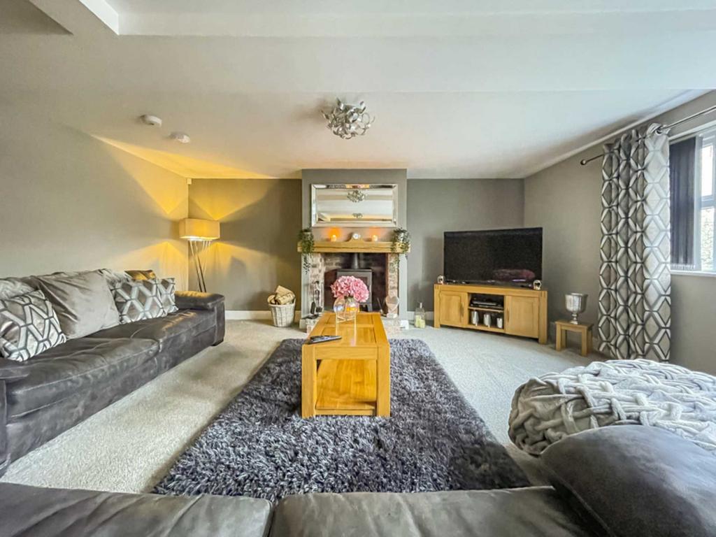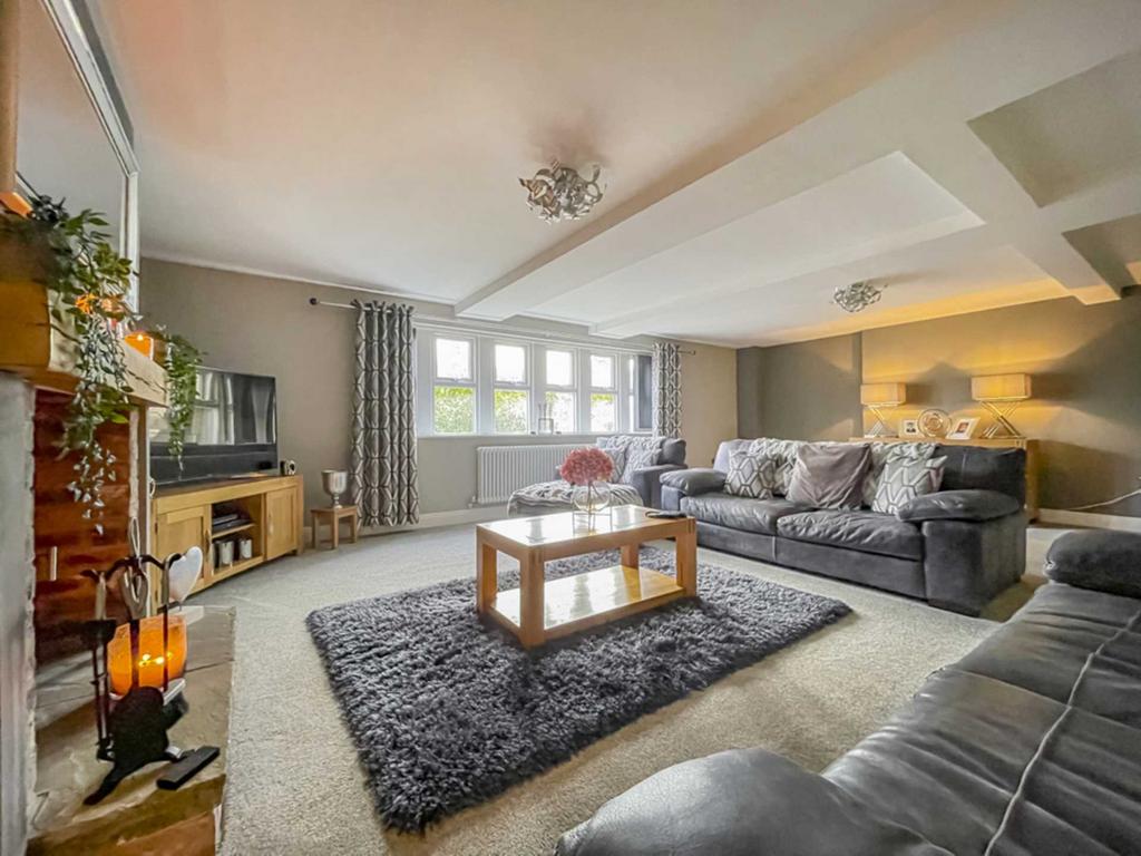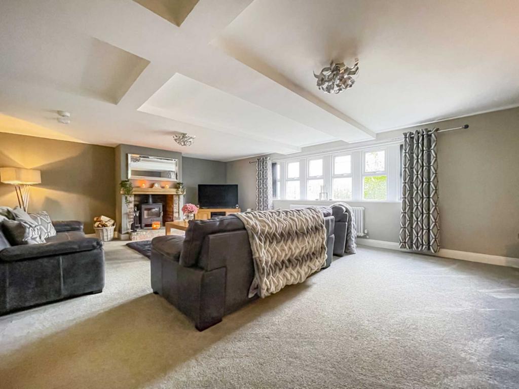 Superb spacious living room with mullion double glazed windows to two aspects providing an abundance of natural light. Feature inglenook style brick built fireplace with wood over mantel, log burning stove.