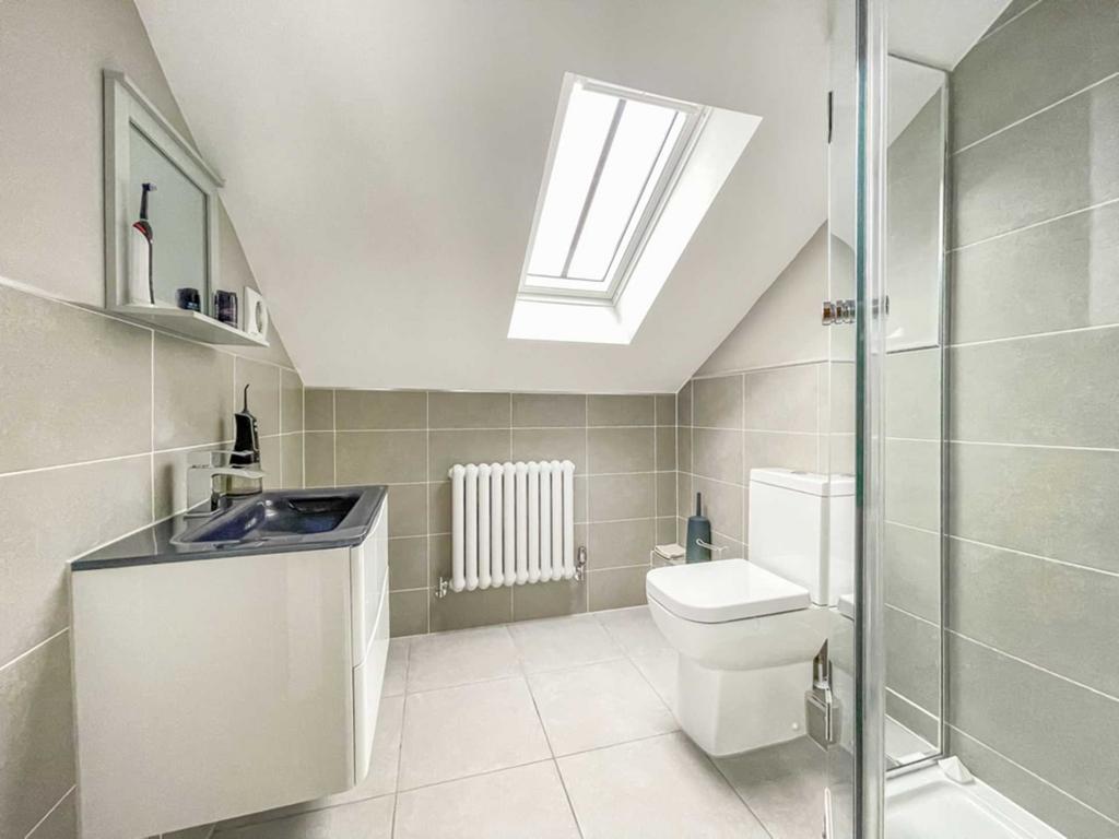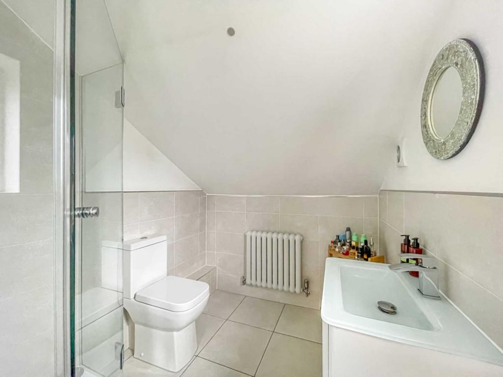 Modern fully tiled walls and floor. Three piece suite comprising shower cubicle, low flush wc and wash hand basin. Wall mounted contemporary radiator.