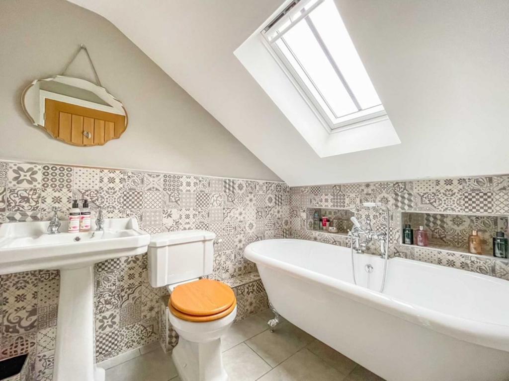 Modern tiling to half height. Three piece suite comprising free standing roll top bath with telephone style mixer tap, pedestal wash hand basin and low flush wc. Wall mounted towel rail.