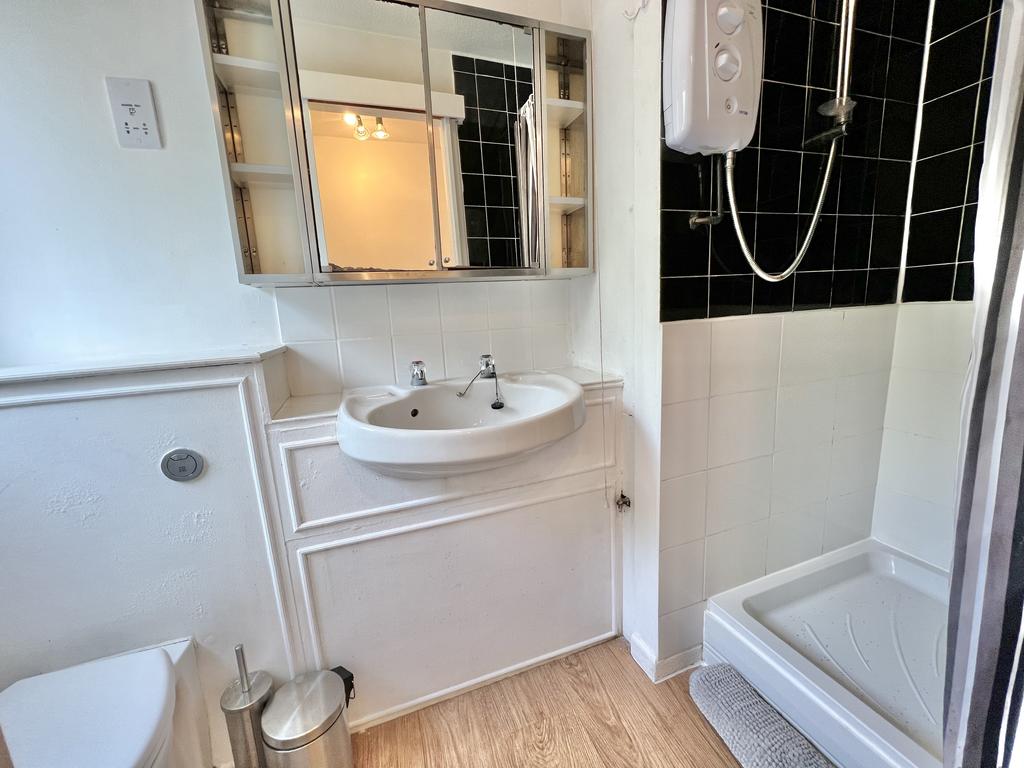 uPVC double-glazed window to the rear elevation, fitted with a white suite with low level w.c., wash hand basin, with medicine cabinet over, shower unit with electric shower.