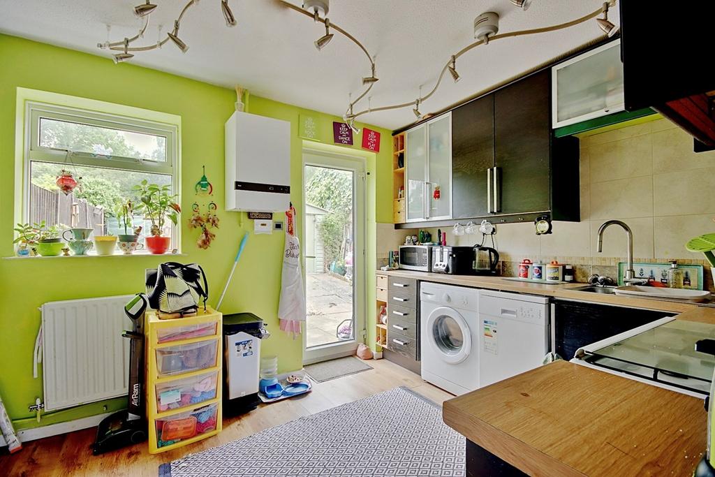 12' 3" x 9' 6" (3.73m x 2.90m) Fitted kitchen with matching base and wall storage cupboards, featuring an integrated 1.5 sink with chrome mixer tap and drainer. Recess for electric oven with four circle hob unit, dishwasher, washing machine and fridge-freezer. Breakfast bar area. Tiled splash-back. Double glazed window and door through to the rear garden. Wall mounted boiler. Ceiling light point and radiator.
