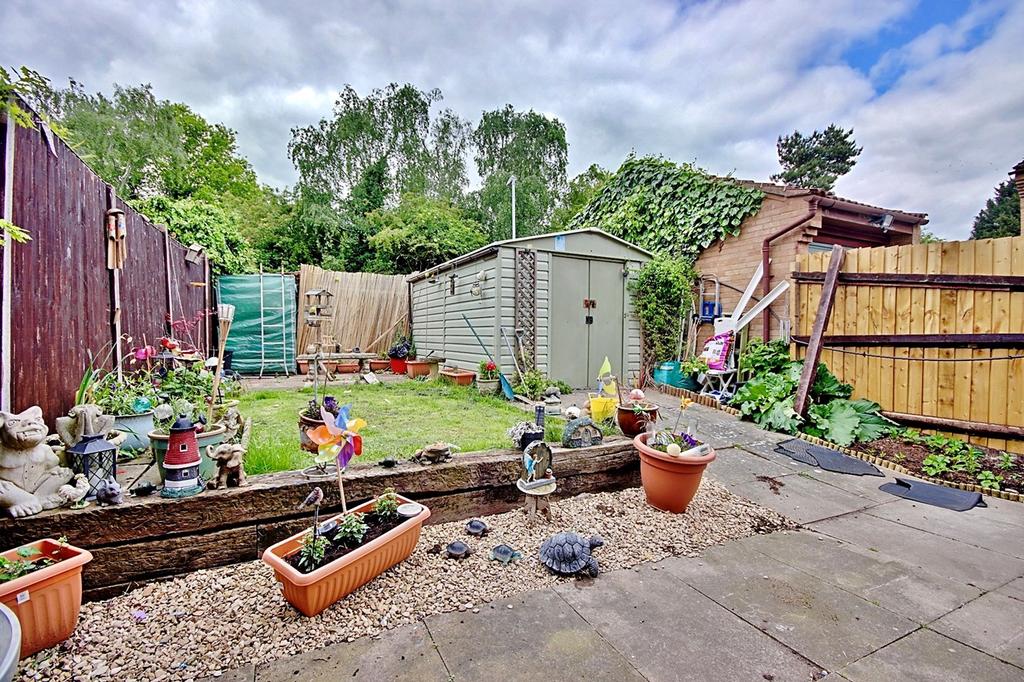 Enclosed laid to lawn rear garden with patio seating area and fence surround. Shed. Access to front of property via side gate.