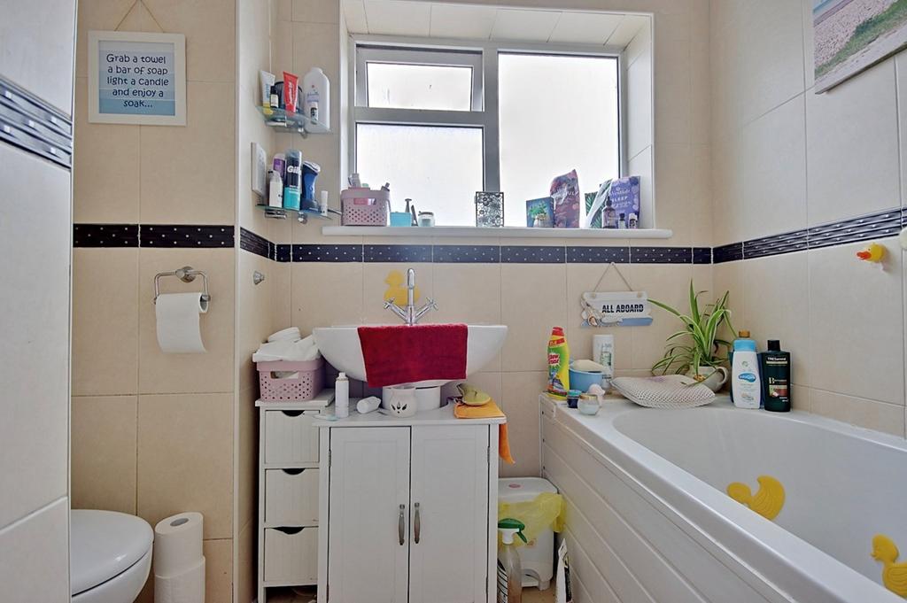 Bath with wall mounted electric shower. Low flush unit toilet and pedestal sink. Obscured double glazed window. Tiled walls and flooring. Ceiling light point and radiator.