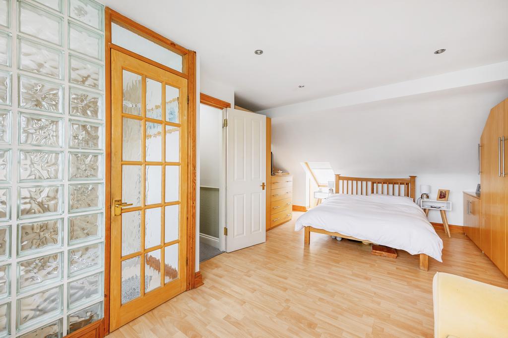 Velux window, uPVC double glazed window, wood flooring, inset spotlights, air conditioning unit, radiator, range of fitted wardrobes and drawer units, access to eaves storage and to: