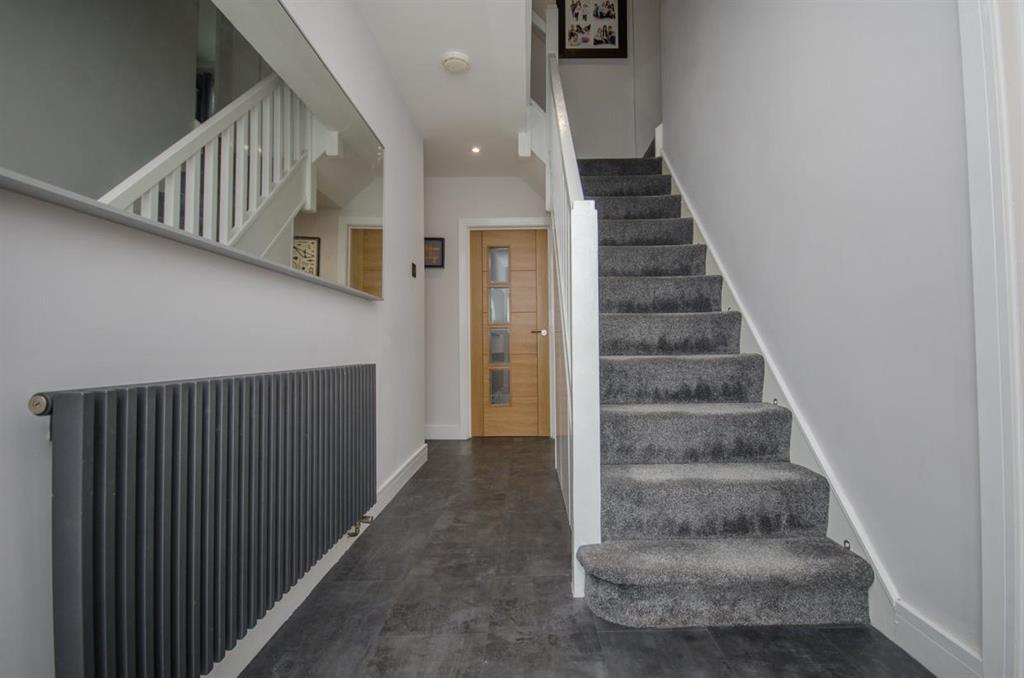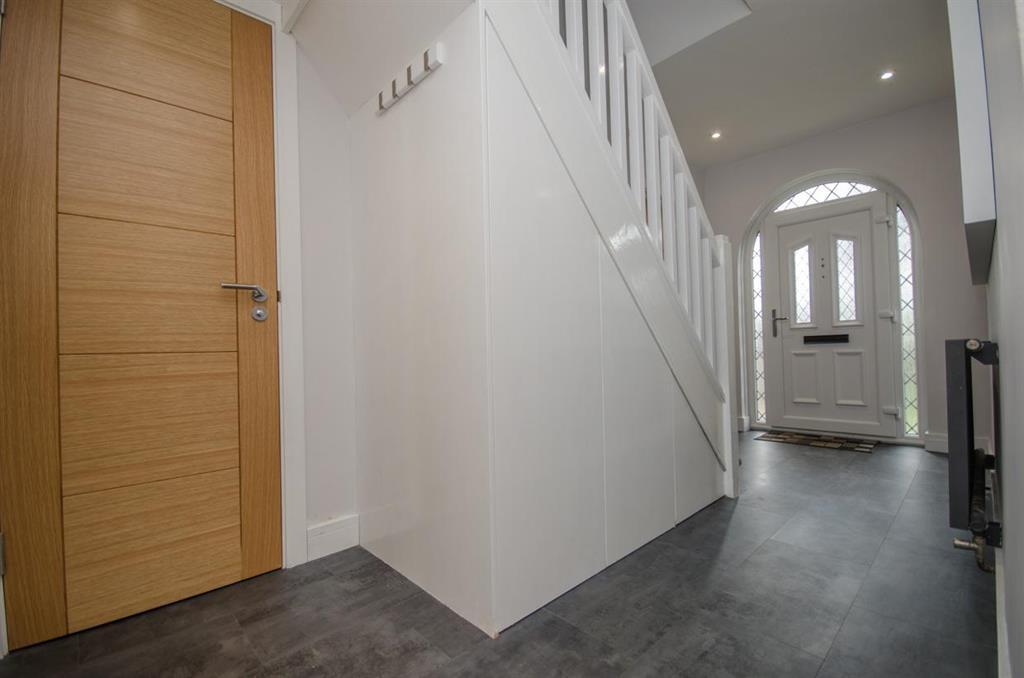 Ceiling with recessed LED spot lights, under stairs storage cupboards, anthracite radiator, stairs with feature LED lighting leading to first floor accommodation and solid oak doors leading into cloakroom, lounge/diner, living room and kitchen.