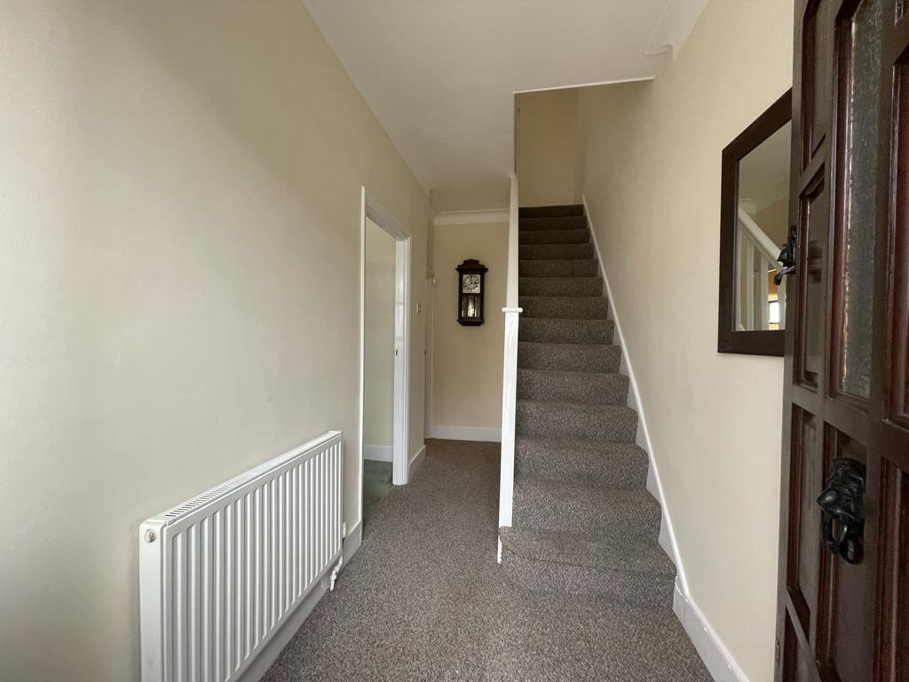 Hallway- 13'10 x 5'5 max- fitted carpet, stairs to first floor, under stair storage cupboard, doors to