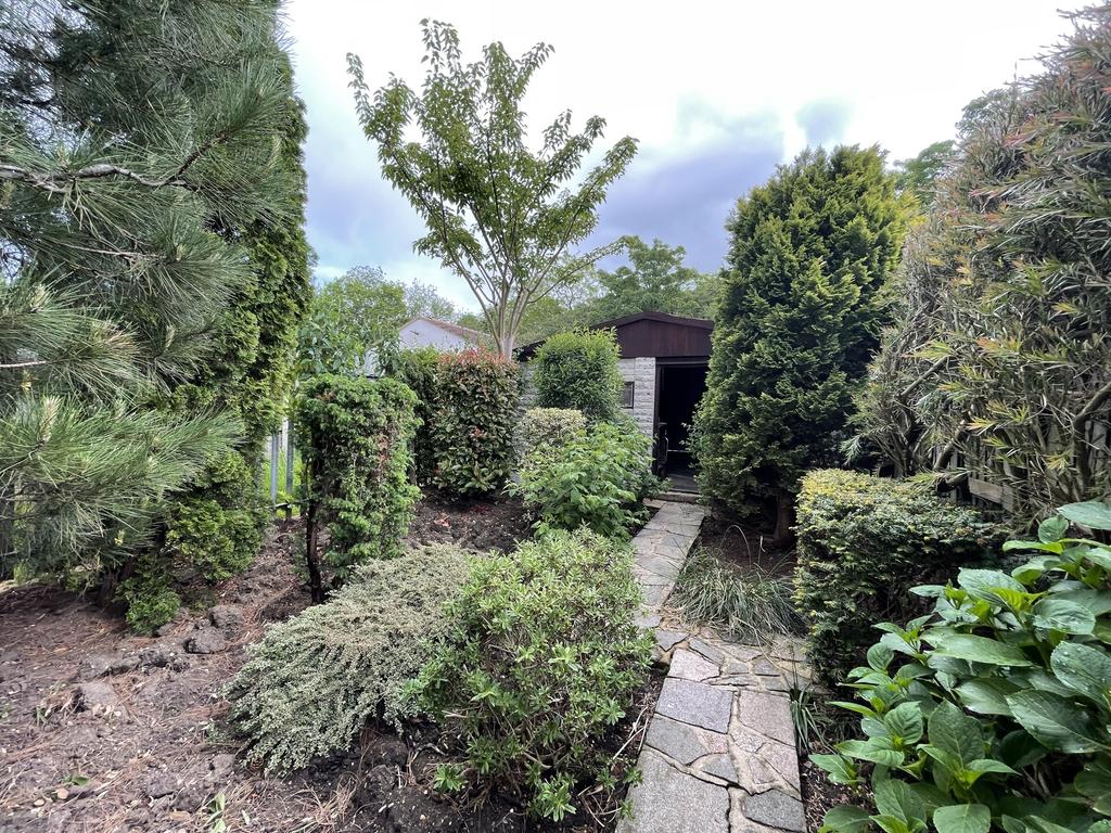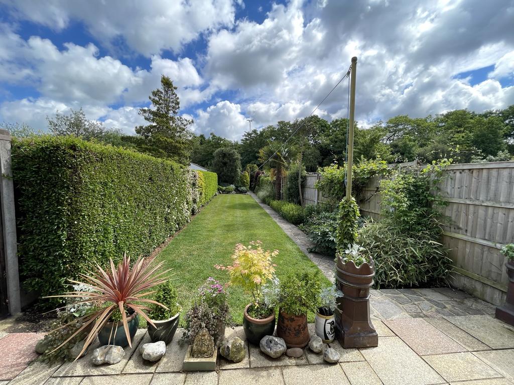 120ft Garden- Paved patio area, hedgerow borders, established shrubs and rockery, path leading to Garage (access via private service road)