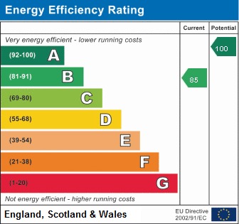 The rear garden has a slab patio accessible by the living room or kitchen-diner and a lush, maintained lawn area. The garden is bordered by 6' fencing and blue slate borders.