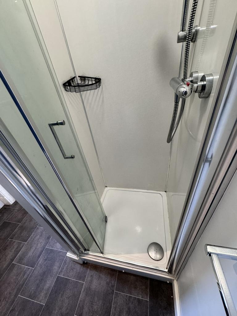 The bedroom boasts laminate wood effect flooring and provides access to the outside area. The hall area features vinyl flooring and leads to the lounge, shower room, and bedroom. The well-fitted shower area is in excellent condition, with a toilet and wash hand basin.