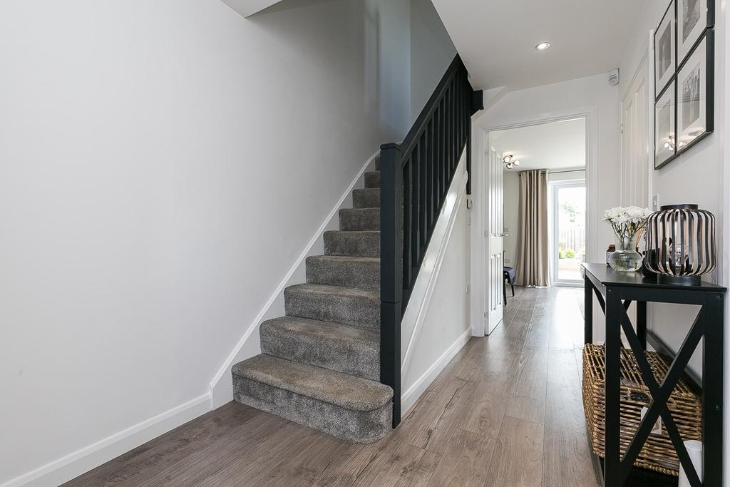Immaculately presented, three-bedroom, end terrace house, with private gardens and an allocated parking space. Set in a new modern residential development in Penicuik, Midlothian. A bright, welcoming hall gives access throughout the ground floor and to the carpeted stairway and features a built-in store cupboard and recessed spotlighting. Set across the rear of the floor plan, the lounge features French patio doors to the rear garden, a wall-mount TV point, two ceiling lights, and access to a deep understairs storage cupboard. Front-facing, the kitchen includes wood-effect worktops with a matching upstand, unit downlighting, a sink with drainer, and an integrated dishwasher, washing machine, fridge/freezer, double oven and ceramic hob. A generous WC has a side aspect window and is fitted with a two-piece suite. On the first floor, the first bedroom is set to the front and has built-in wardrobes, carpeted flooring and a TV point. Two further flexible bedrooms are set to the rear, both with carpeted flooring and pendant light fittings. The family bathroom has a side aspect window and is fitted with a three-piece suite including a mains mixer shower over the bath and tiled splash walls.