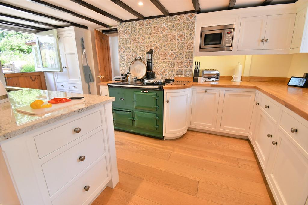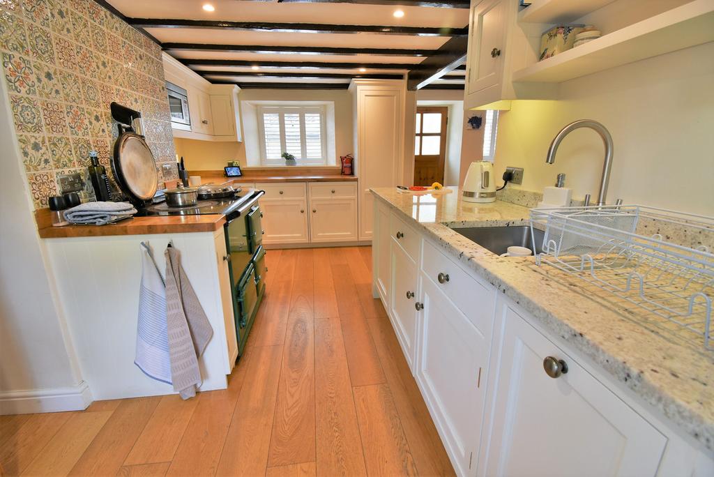 Interior - Stepping into the cottage via the porch and then into the dining room with beamed ceiling and oak flooring. A doorway leads to the staircase and an opening creates a more open plan feeling leading into the kitchen. Fitted high quality bespoke kitchen with a range of base and wall mounted units with integral fridge, freezer, washer dryer and dishwasher, the worktops are made from solid wood & marble and the oak floor flows from the dining room. There is a two oven gas Aga which is totally separate to the heating system which is powered by a gas central heating boiler located in the useful pantry accessed from the kitchen. An attractive oak floored sitting room with exposed beams has a dual aspect creating a light room with feature fireplace and multi fuel burning Clearview stove.