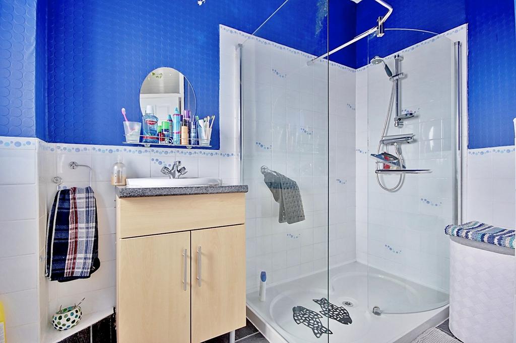 Double shower cubicle with wall mounted mixer shower. Low flush unit toilet and sink with inbuilt vanity storage cupboard. Part tiled walls. Obscured double glazed window through to the rear aspect. Airing cupboard with door access. Ceiling light point and towel radiator.