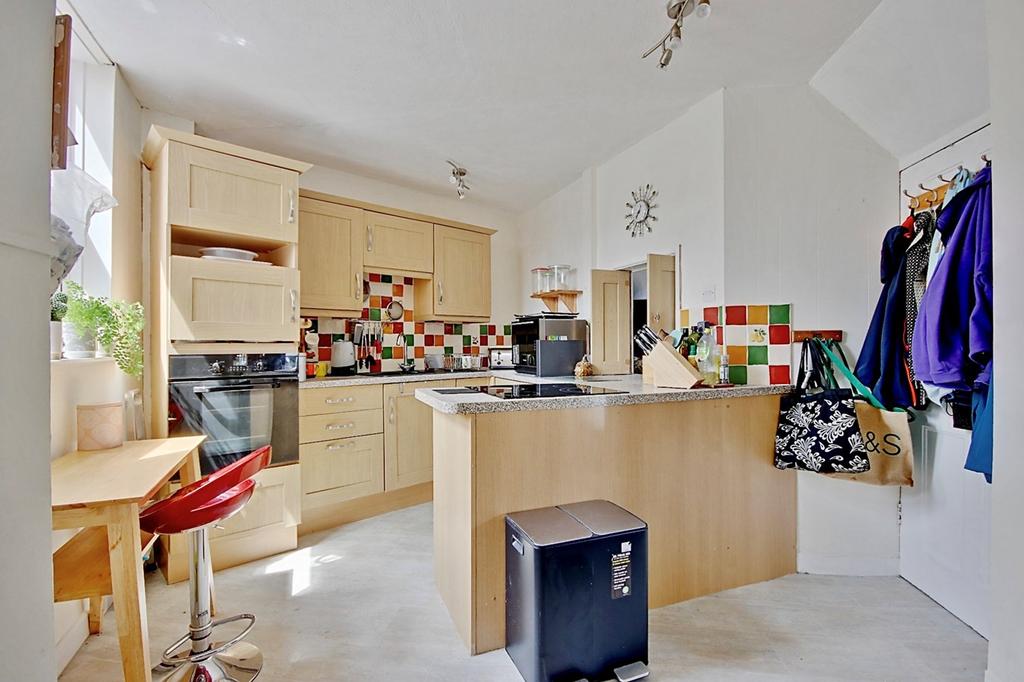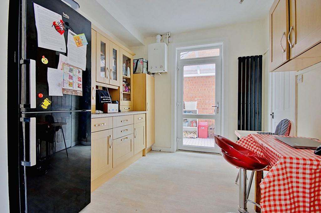 9' 4" (Min) x 22' 0" (Max) (2.84m x 6.71m) Fitted kitchen with matching base and wall storage cupboards featuring integrated appliances including; 1.5 sink with chrome mixer tap and drainer, Electric oven & Four circle ceramic hob unit. Recess for large fridge-freezer. Serving hatch through to the living room. Tiled splash-back. Door through to the cellar. Wall mounted Worcester Bosch boiler. Tall radiator unit and ceiling light point.