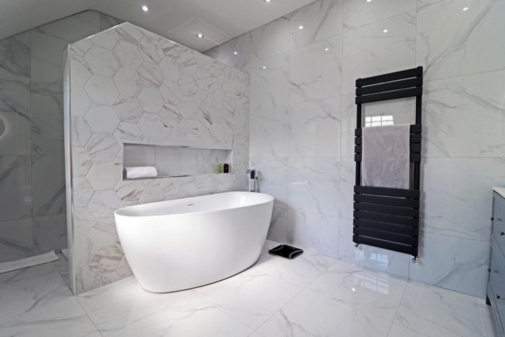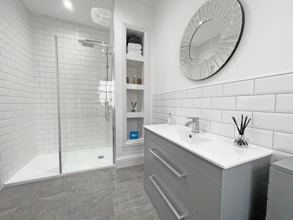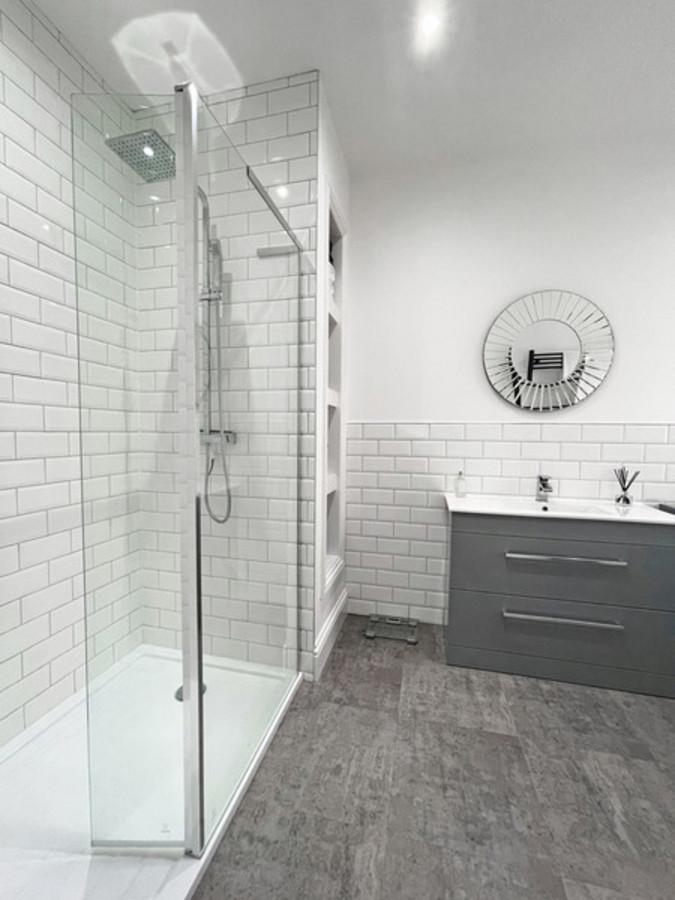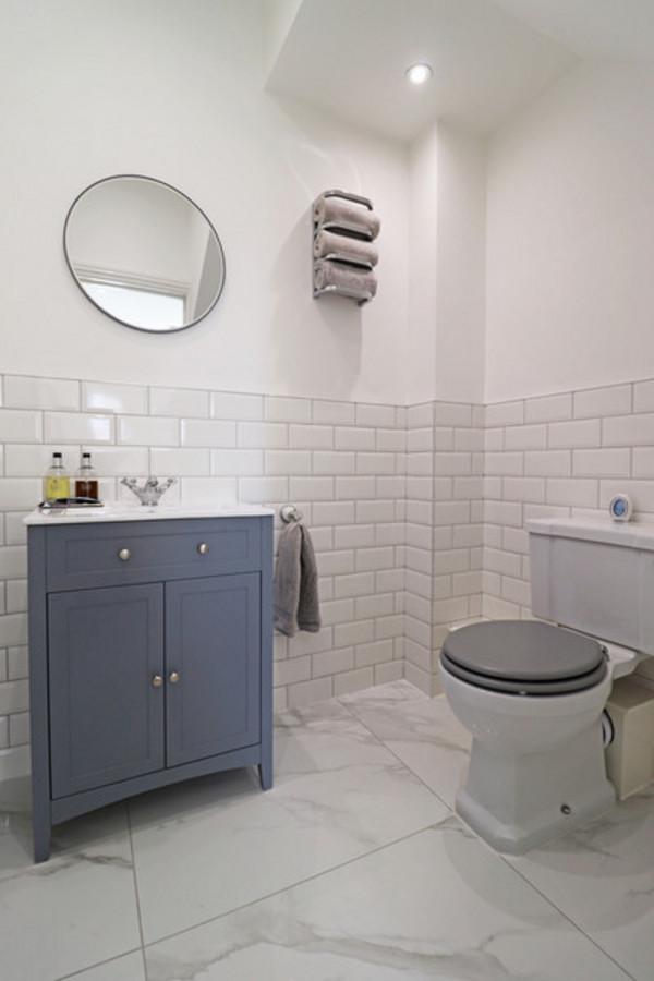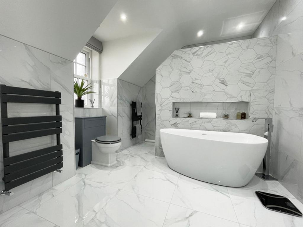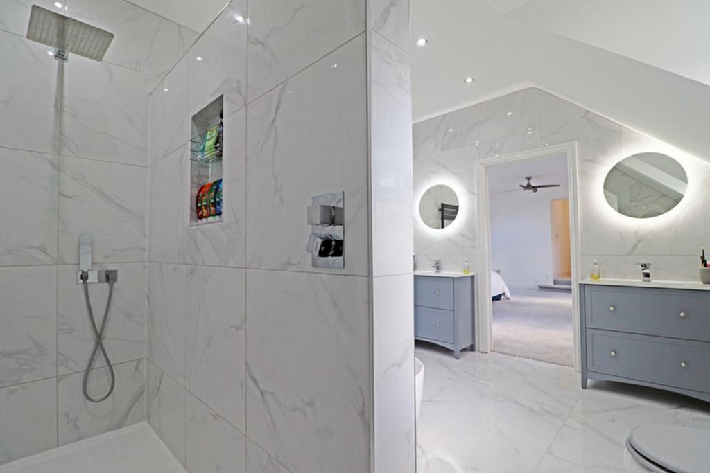 The Principal master bathroom is a beautiful space, finished to an extremely high standard. Natural light streams into the space via a slide & sash dormer window. A large freestanding bath plays centre stage as an elegant main feature with chrome floor standing taps, with a large walking shower behind. The bathroom is fully tiled throughout with white marbled tiles. The adjoining wall plays host two modern grey vanity units with illuminated circular heated mirrors, one either side of the door. The bathroom also features low flush WC, three towel radiators, extractor and underfloor heating.