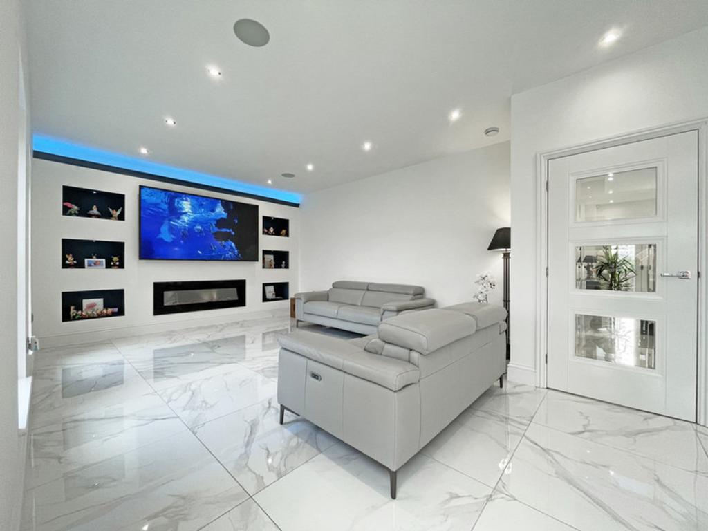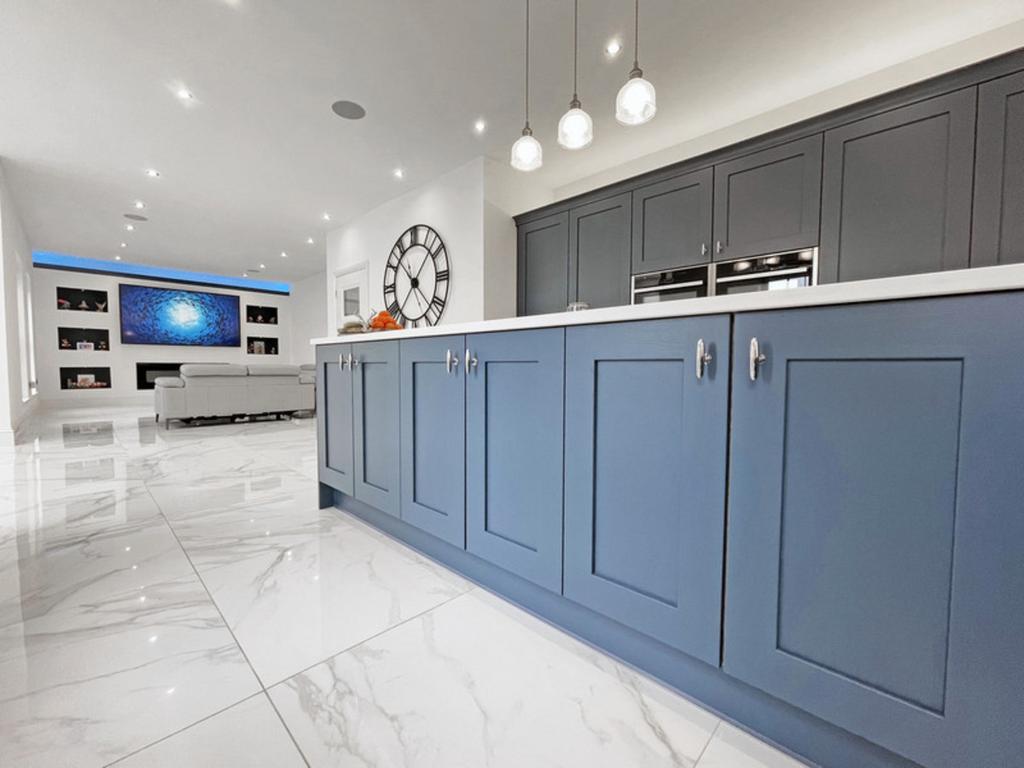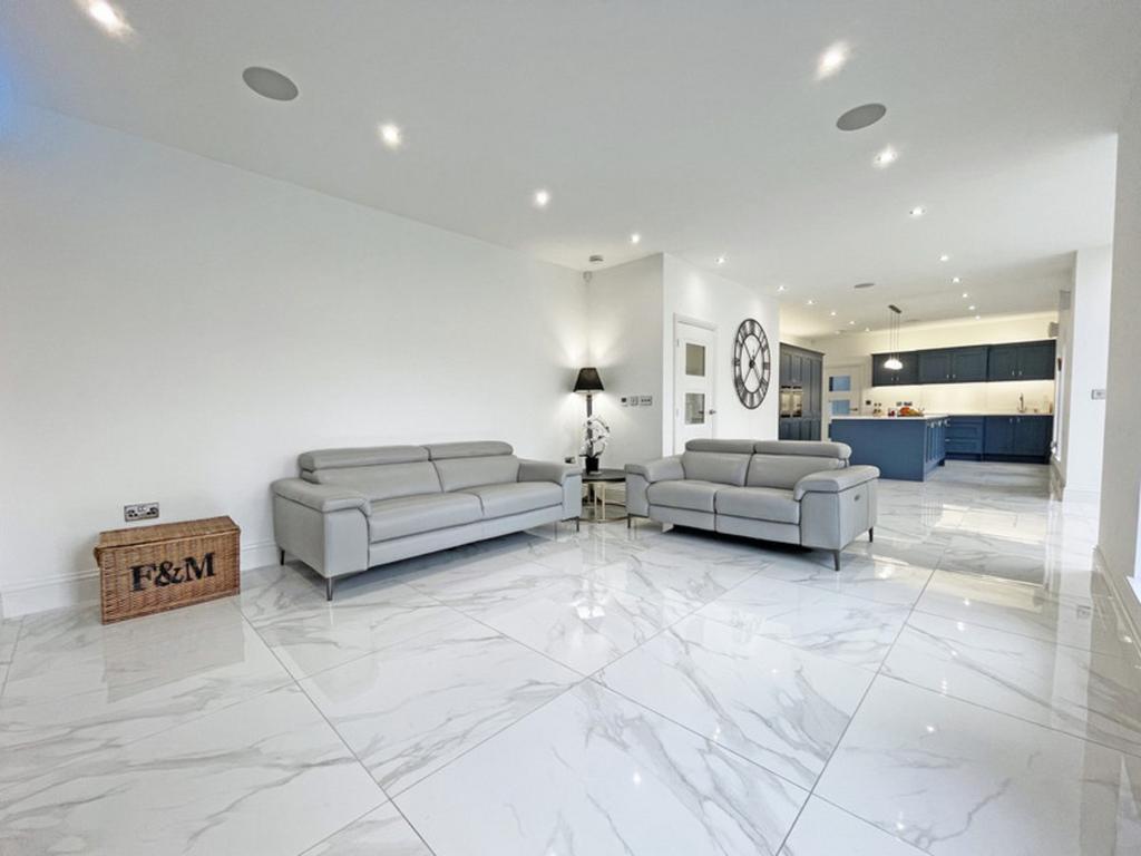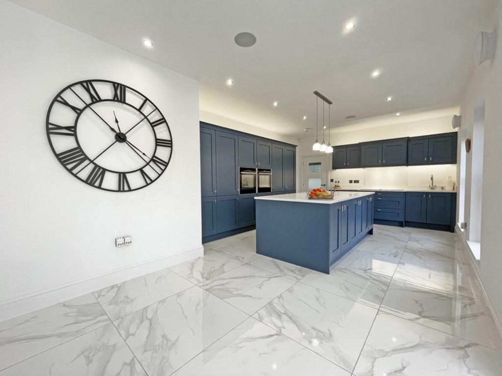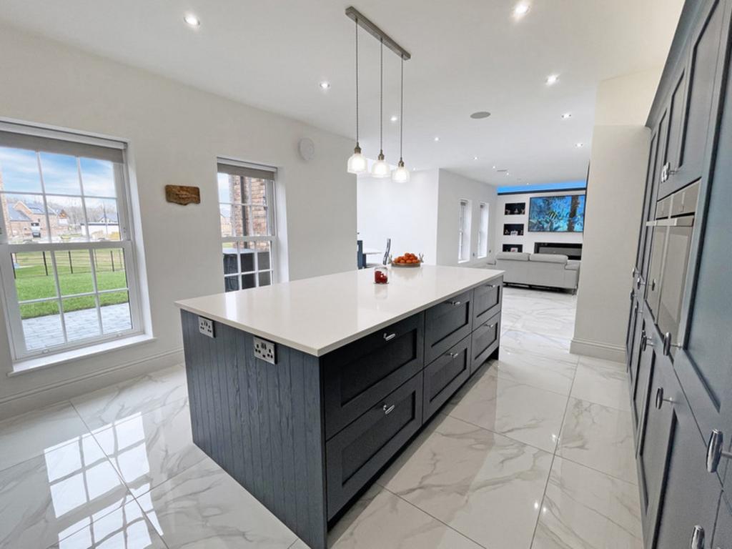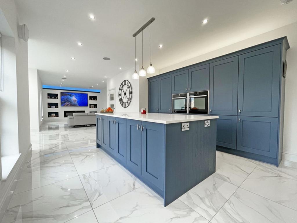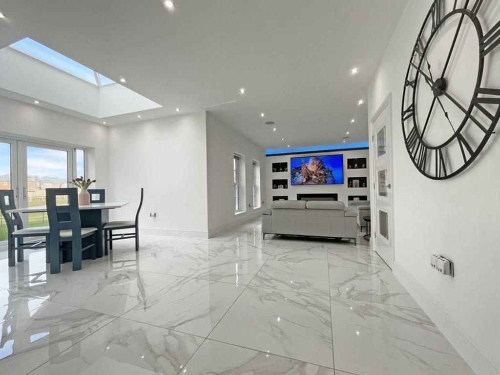 The kitchen is stunning with delightfully modern solid wood blue units and contrasting white quartz worktops, with an impressively large central island creating a real statement piece within the space. Finished to an extremely high standard the kitchen has a wealth of integrated appliances inclusive of an Neff induction hob with twin motor extractor, 2x Neff hide & slide ovens, 2x high power additional wall extractor units, 2 integrated fridge-freezers, feature / accent lighting and integrated Sonos Speaker System. The dining space is centrally located within the open plan space directly underneath the lovely roof lantern. The family room enjoys a feature TV Media wall with an integrated remote controlled electric fire, state-of-the- art 86” LG Smart TV, 6 nooks all with double sockets and Sonos Speaker System. Underfloor heating runs throughout the space.