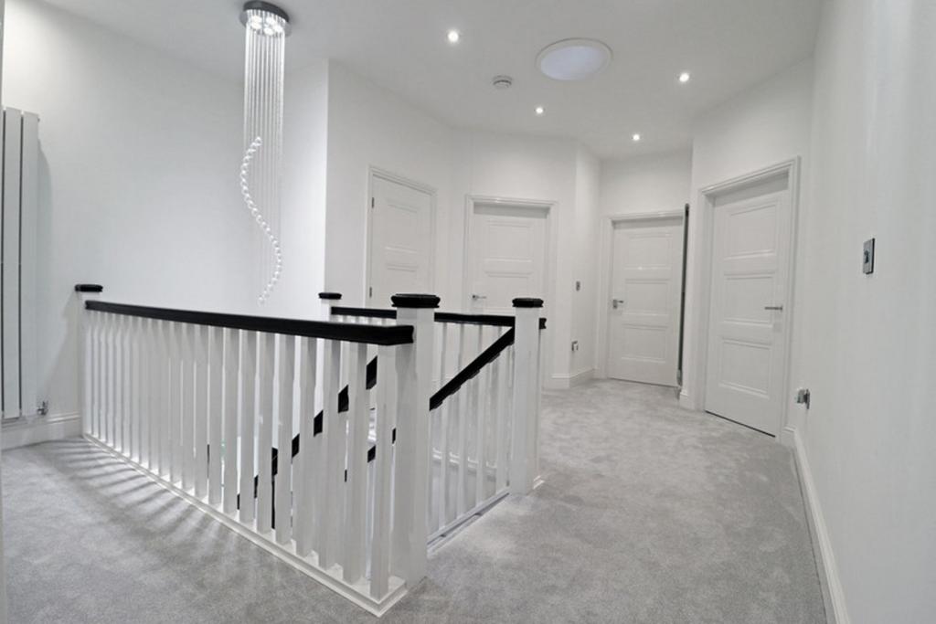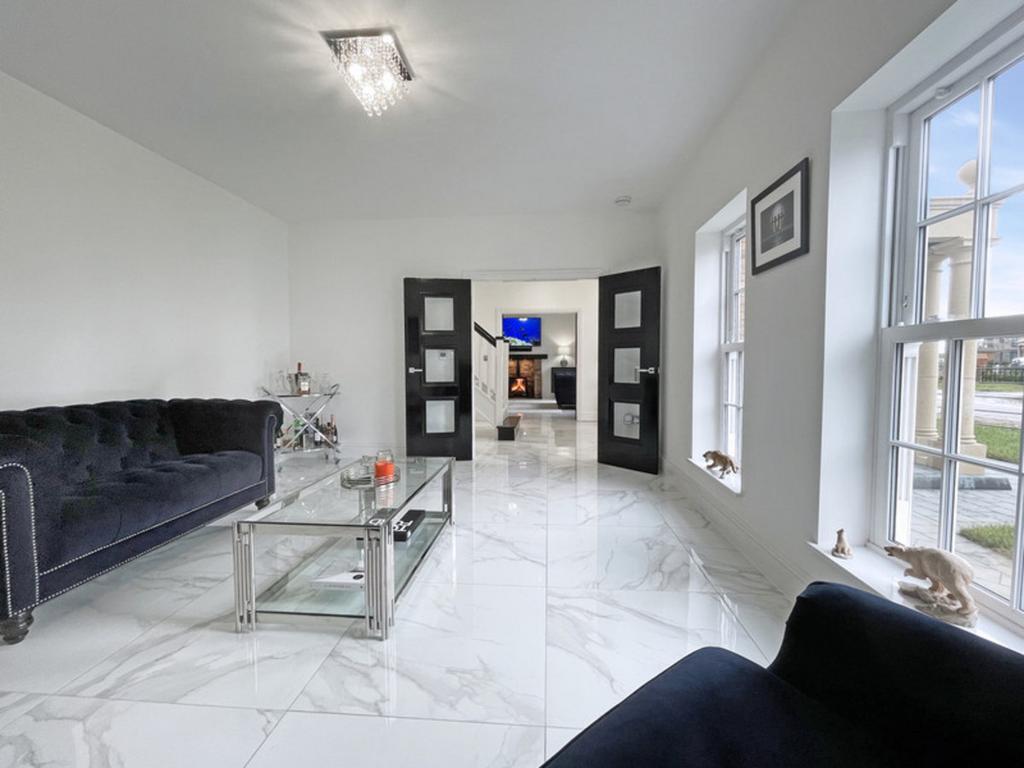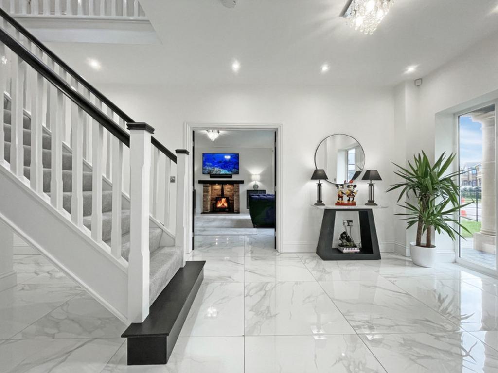 As you enter the property via the main entrance you are welcomed into a beautiful and spacious reception hallway finished in a modern monochrome style with a central main staircase, 800mm gloss white marbled floor tiles with underfloor heating, with part glazed double doors leading to two front aspect lounge rooms.